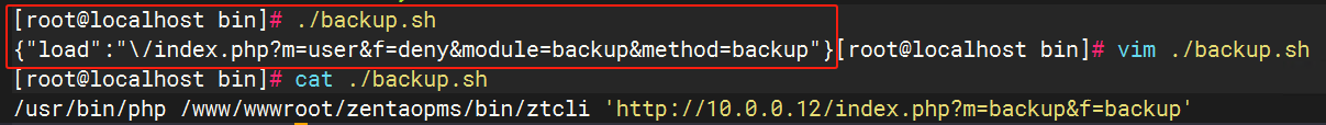 - 在服務器上執行 init.sh 脚本初始化后,執行备份脚本 backup.sh,备份未執行,返回:{"load":"\/index.php?m=user&f=deny&module=backup&method=backup"},如下图