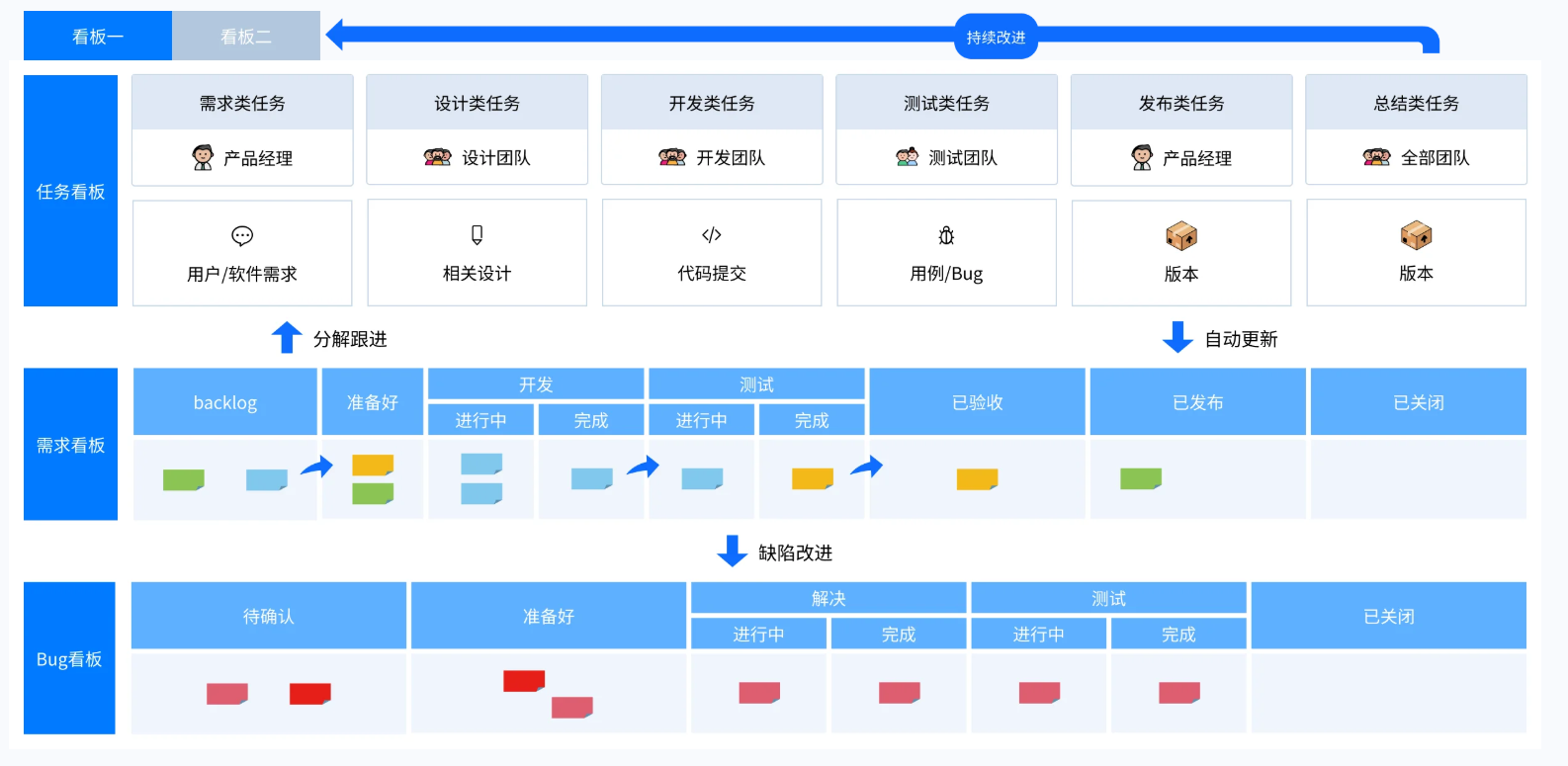 如果說儀表盤提供了宏觀感知,那麽看板和甘特圖則提供了對工作流程的圖像化展示。這些視圖讓每個成員都能快速找到自己的工作在整個價值鏈中的位置,建立起對流程和依賴的深刻感知。信息難同步,任務狀態不透明?禅道看板讓工作流程看得見
