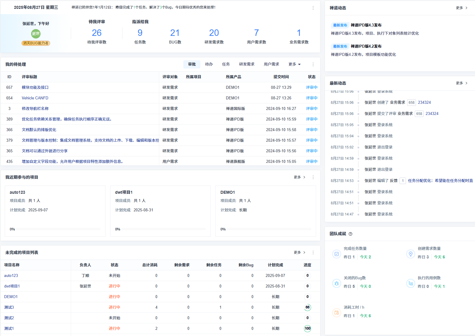 既然感知缺失是远程项目失控的重要原因之一,那么解决方案的核心就在于构建团队高感知的項目管理协作体系。禅道項目管理工具通过项目仪表盘、可视化工具链和自动化集成,在保持異步工作靈活性的同時,讓團隊對項目狀態的感知始終保持同步。1.項目儀表盤:宏觀感知項目狀態