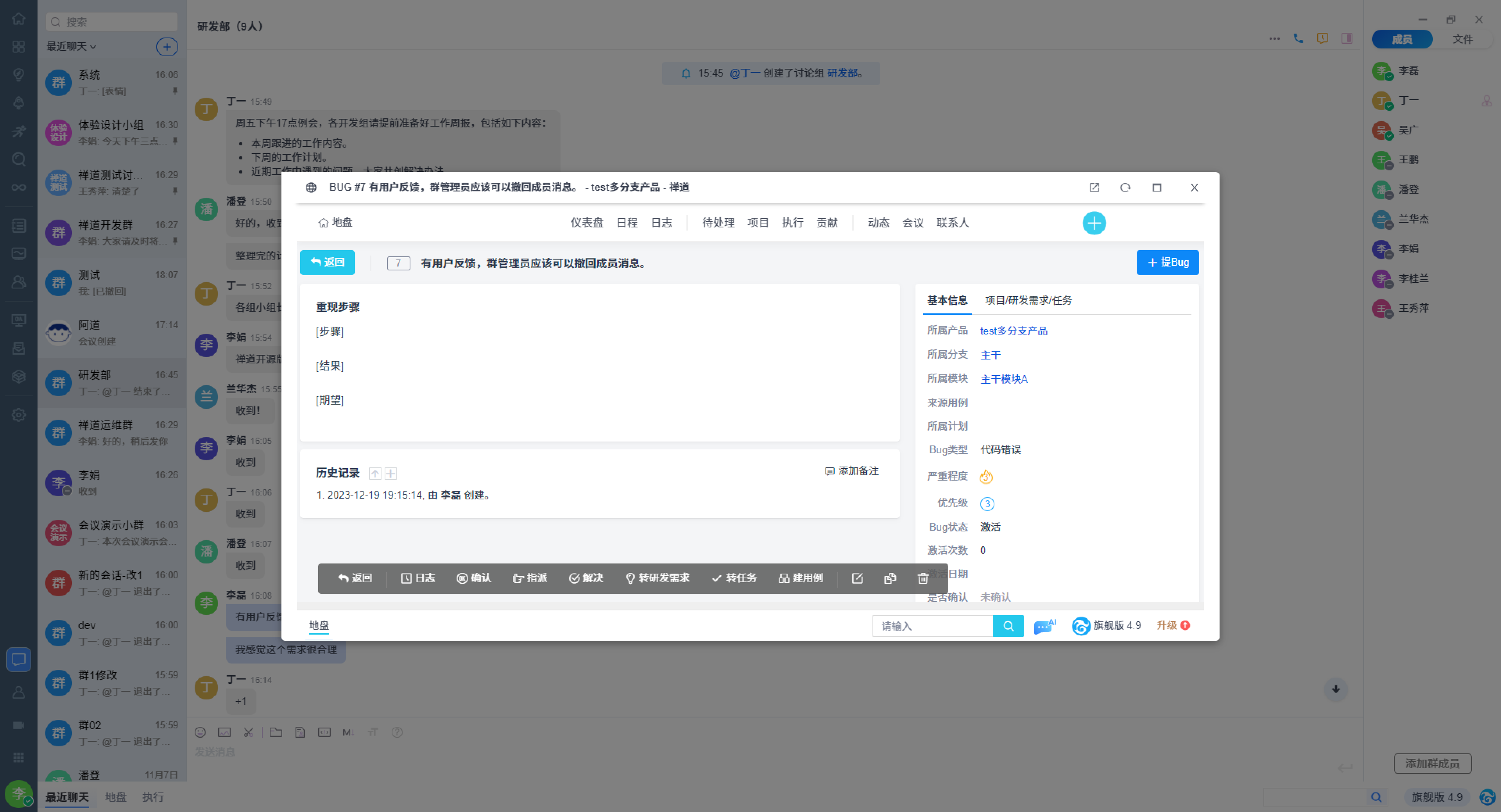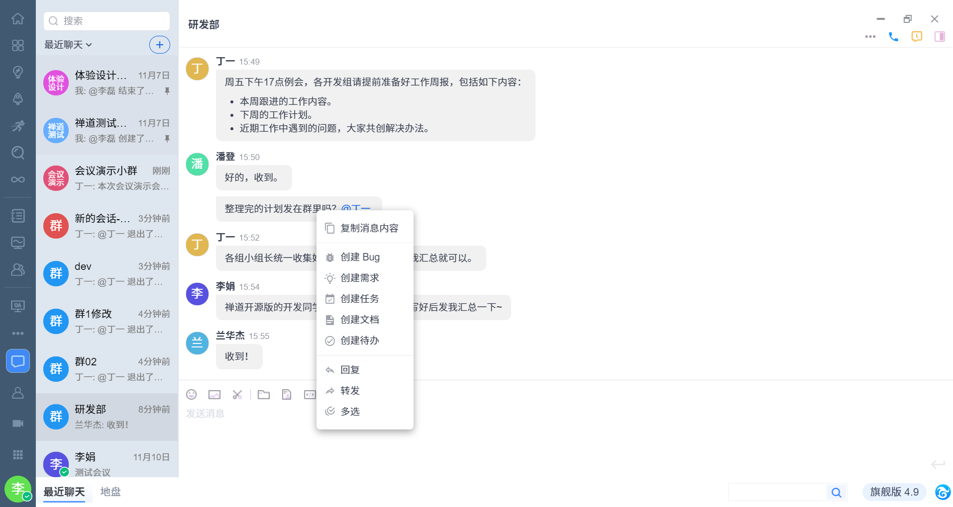 在禅道客戶端中項目團隊成員可以進行成員溝通、小組討論、文件傳輸、任務指派等,聊天窗口右鍵直接將消息轉爲Bug/需求/任務,避免二次錄入導致的信息丟失風險;關鍵信息實時推送至相關成員,真正實現高效管理和流程協作。