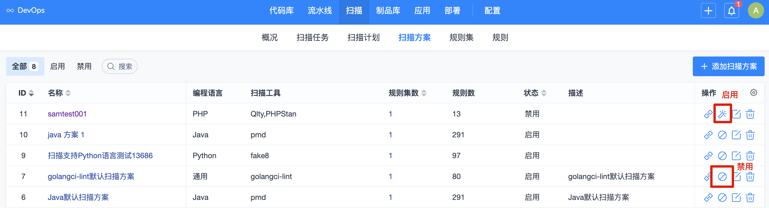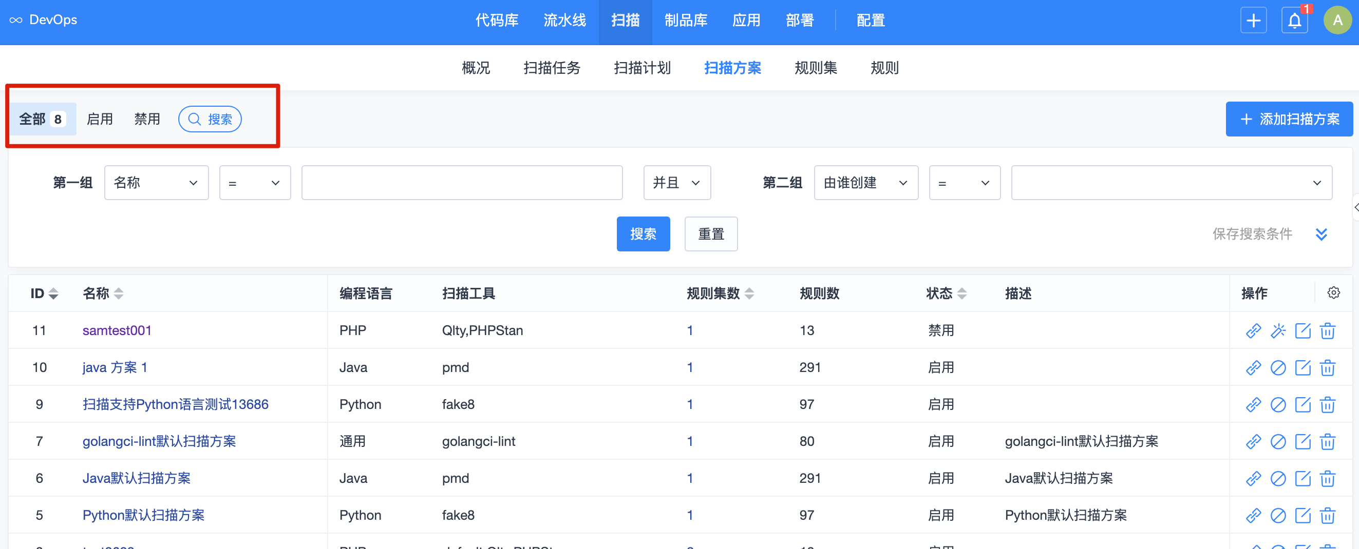 在掃描方案列表上方,设有 “启用”“禁用” 检索标签。点击 “启用” 标签,即可筛选出所有处于启用状态的掃描方案;点击 “禁用” 标签,可展示所有处于禁用状态的掃描方案。