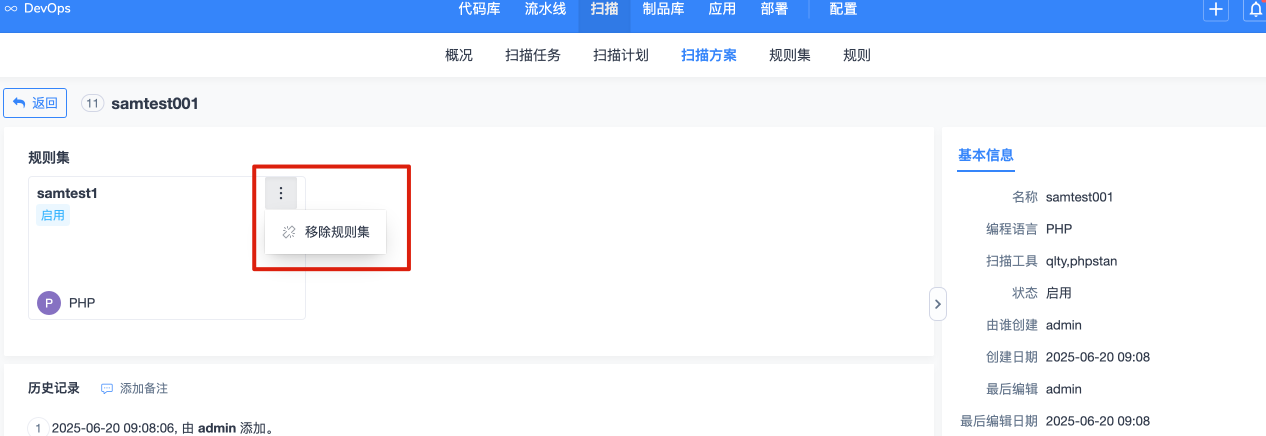 在掃描方案的详情中的规则集列表操作栏中,点击 “移除规则集” 按钮。此时会弹出弹窗提示 ,点击 “确定” 按钮,该规则集将从当前掃描方案中移除,后续掃描时此规则集不再参与;若点击 “取消”,则规则集保留在掃描方案中。