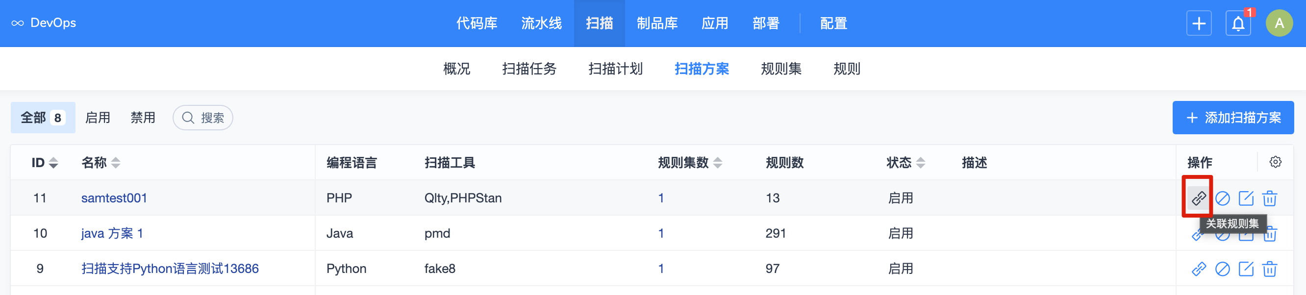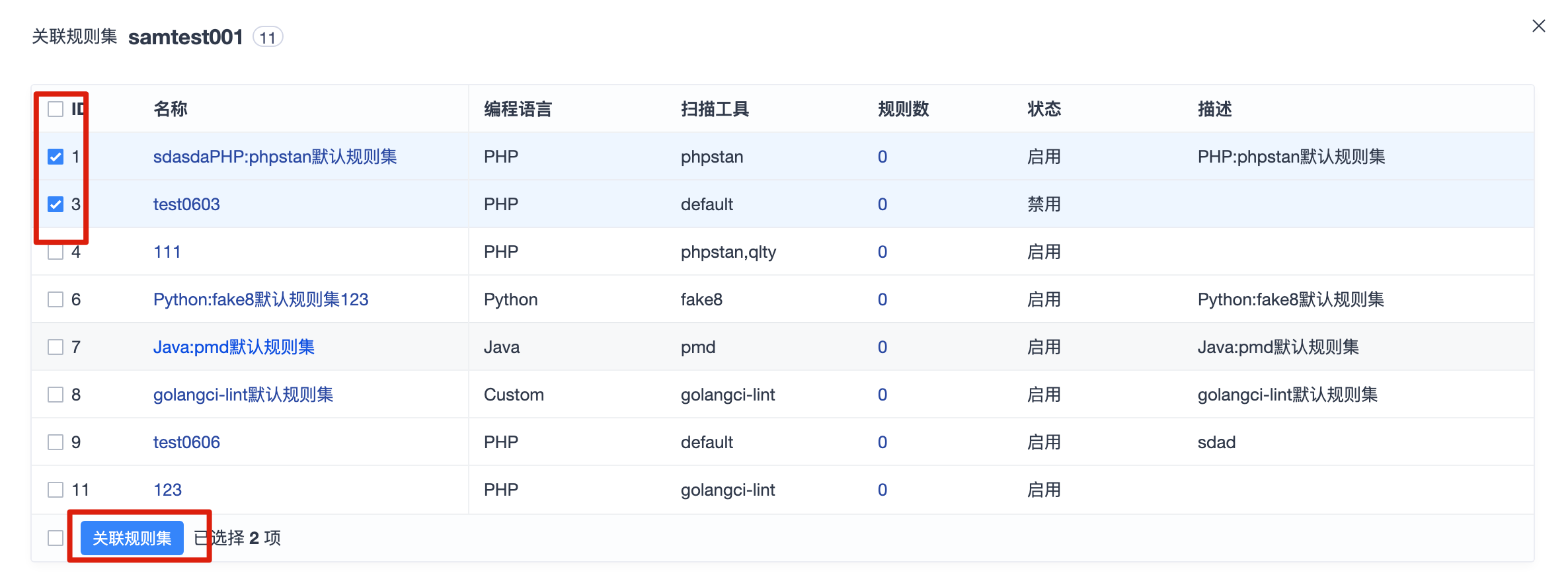 - **从操作栏关联**:在掃描方案列表中,找到需要关联规则集的新建掃描方案,点击其操作栏中的 “关联规则集” 按钮。系统会弹出规则集选择界面,展示所有可选择的规则集,勾选需要关联的规则集,点击确认即可完成关联。