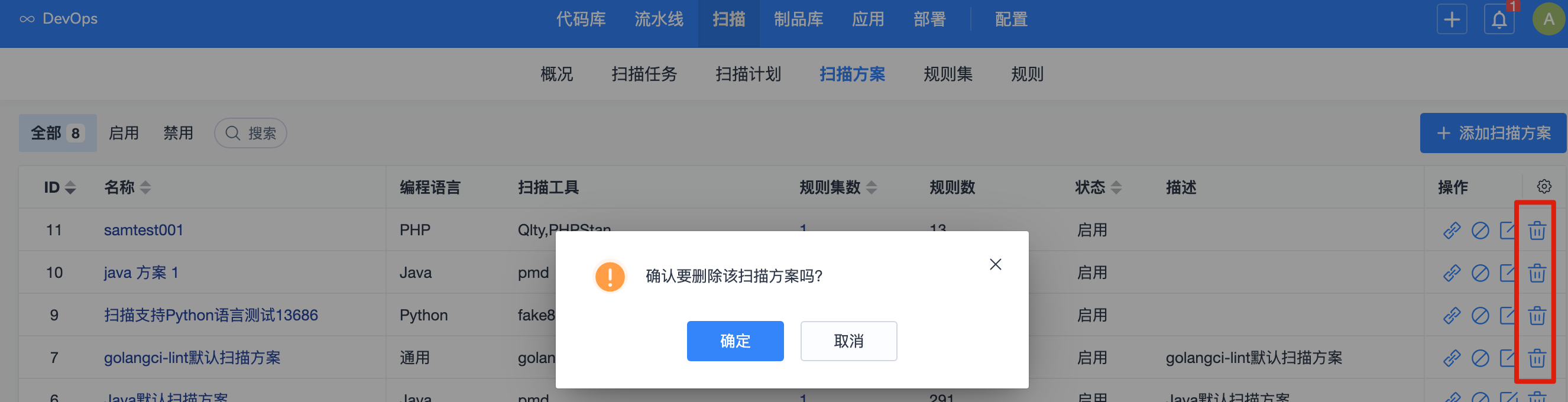 对于不再需要的新建掃描方案,在掃描方案列表中,点击其操作栏中的 “删除” 按钮。系统会弹出确认删除提示框,确认无误后点击 “确定”,该掃描方案及其关联信息将被删除。默认掃描方案不支持删除操作。