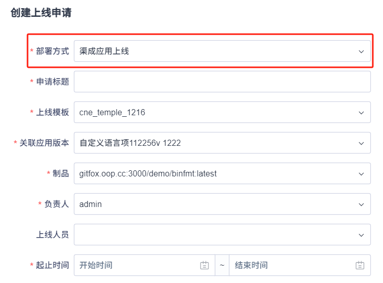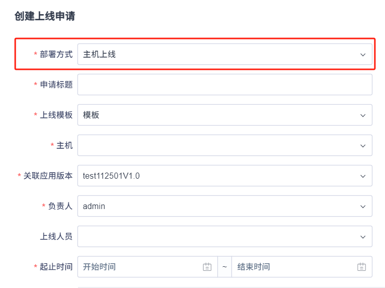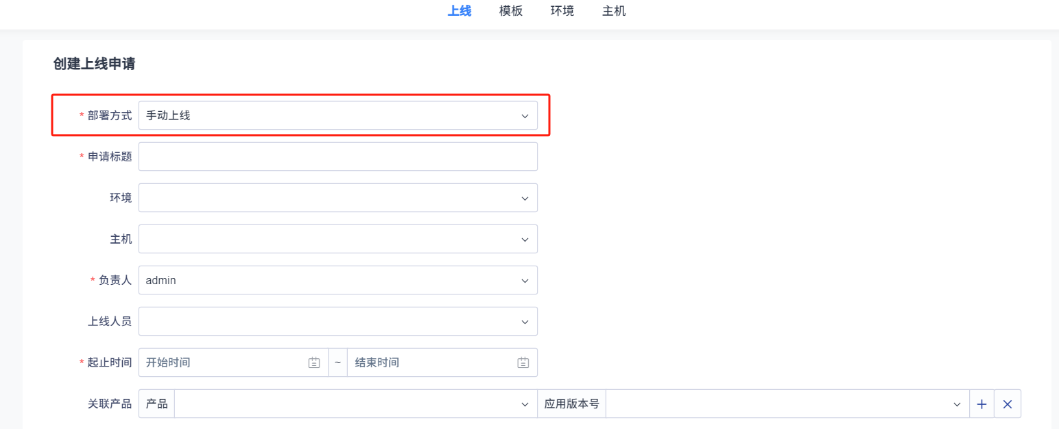 部署方式为主机上线和渠成上线时,産品和发布为必填项,并且发布下需要有制品,这样才可以上线成功,。
