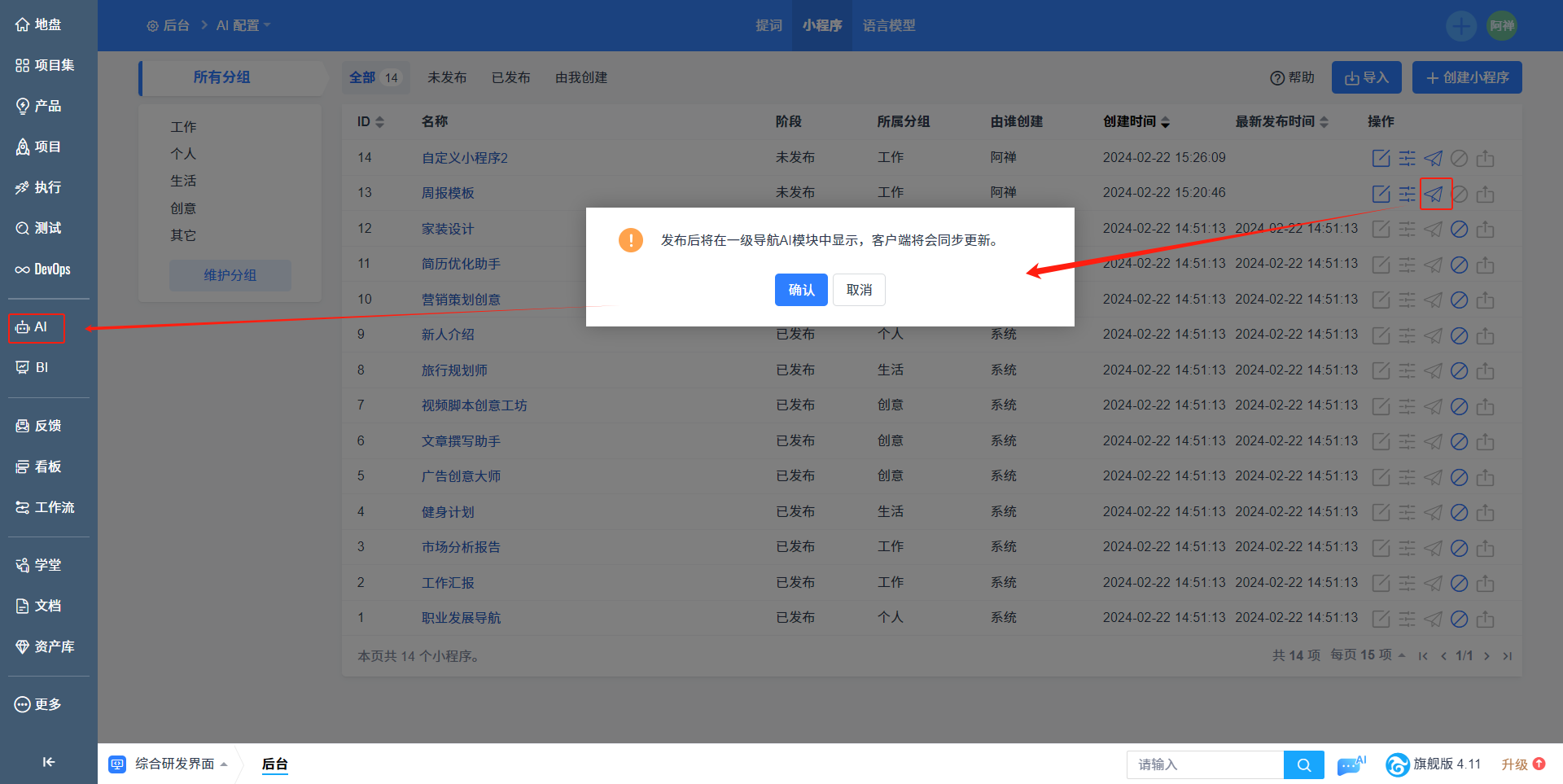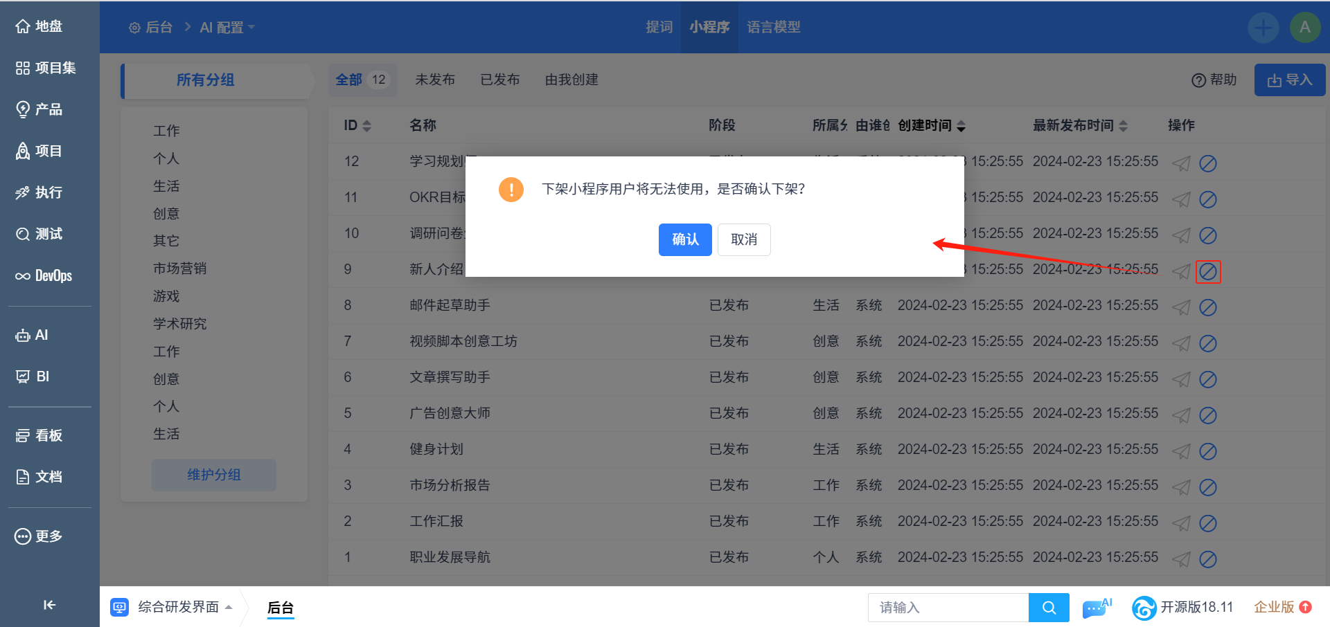 1. 在禅道開源版中,系统将会内置12个内置小程序,默认发布,管理员可以禁用或再次发布AI小程序。