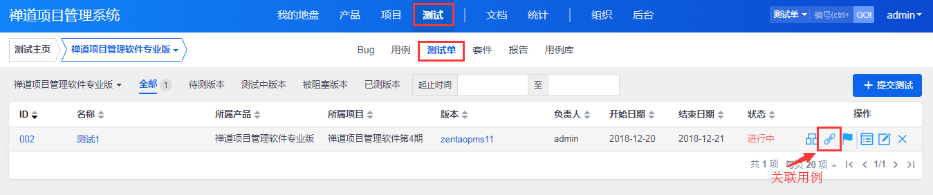 选择某一个待测版本,点击右侧“关联用例”按钮,即可出现关联測試用例的页面。