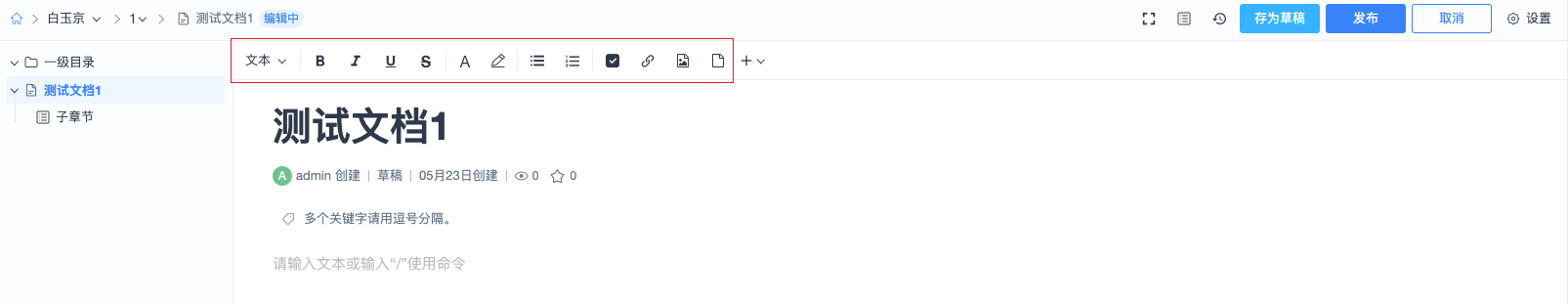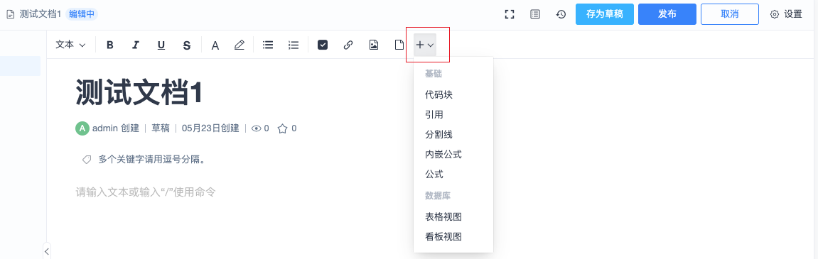 【20.8版本起】【开源版及以上版本】文檔更换了新編輯器,支持通过简单的“/”命令输入快速執行常用操作,增加了一些编辑器的功能。