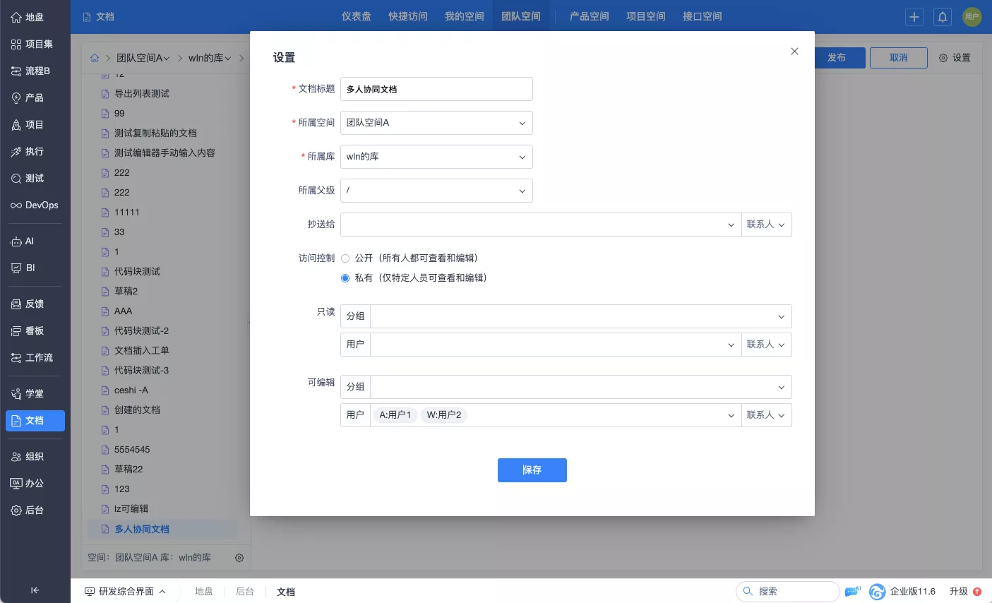 每篇文檔都设有访问權限控制,用戶可以根据需要,为他人分配文檔的读写權限。在创建文檔时、或在文檔编辑页面点击設置按钮,在弹窗中为本篇文檔設置協作者的读写權限。