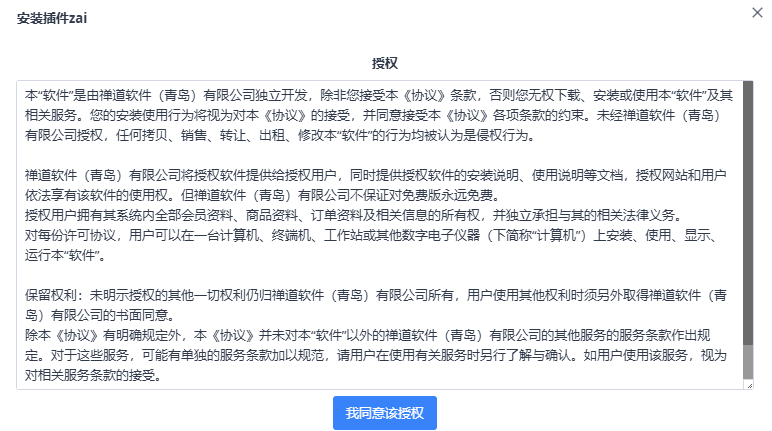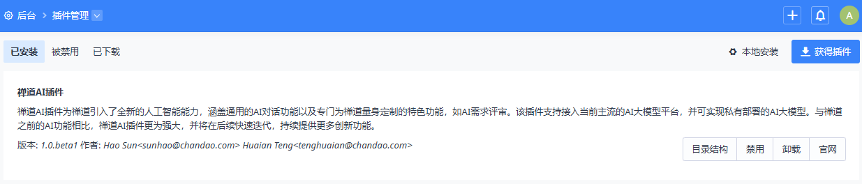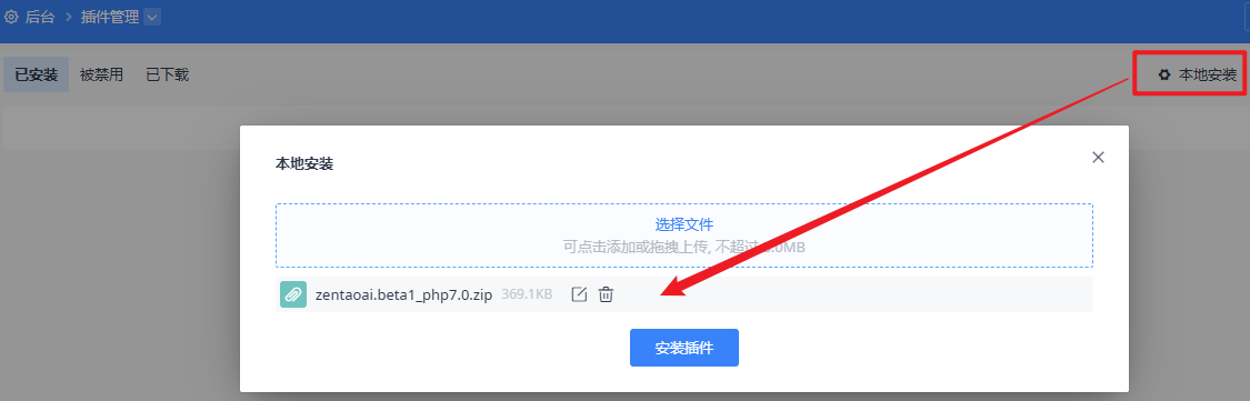 在您的禅道中的后台->插件管理->本地安装 选择您下載的AI插件 按照流程进行安装。