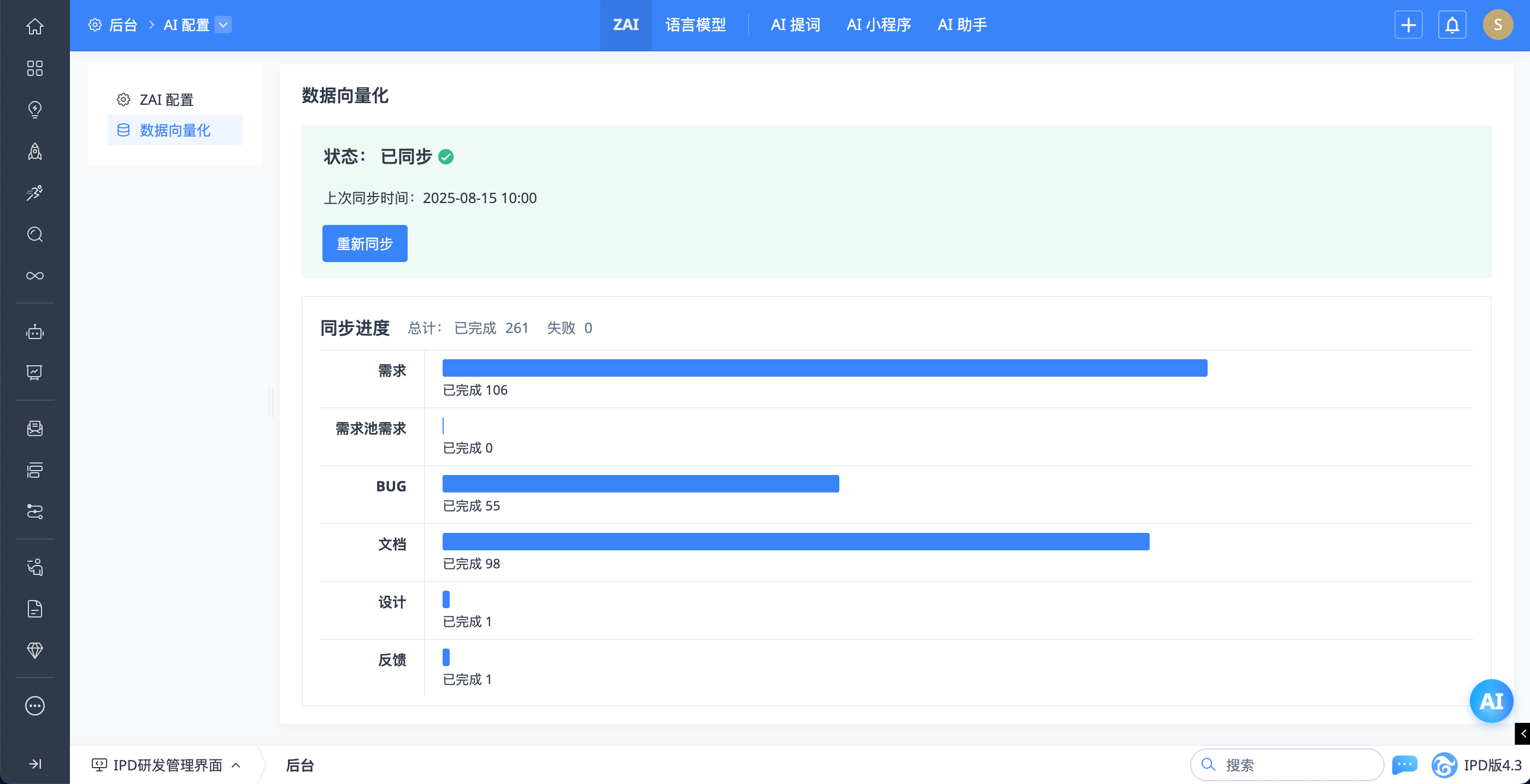 数据向量化会将禅道系统内产生的数据(例如需求、BUG、文檔等)进行向量化,便于在 AI 对话中引用,让 AI 更准确地回答问题。