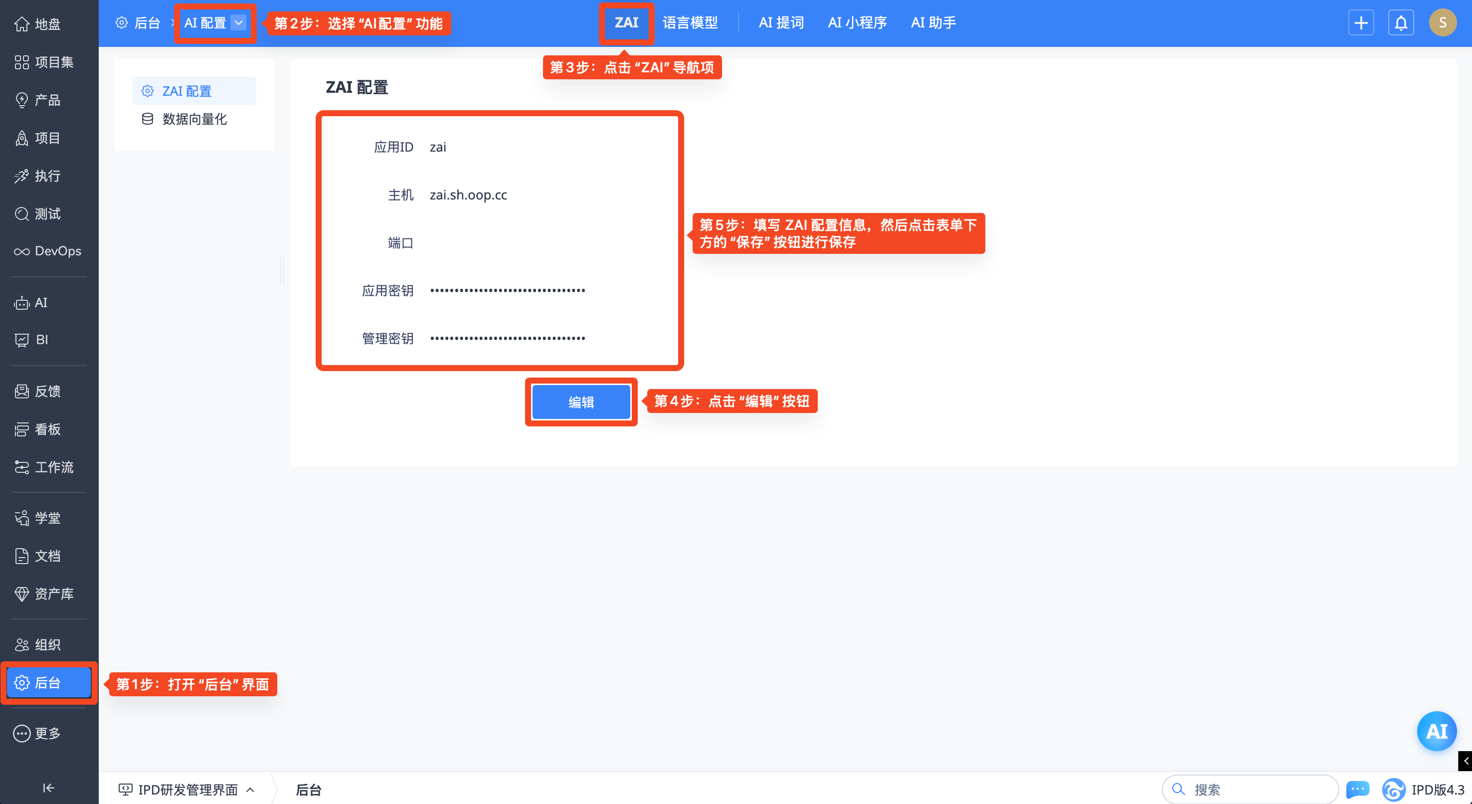 当准备好上述信息后,就可以打开禅道“后台 → AI 配置 → ZAI”页面,点击编辑按钮,将上述配置填写在表单中,然后进行保存即可。