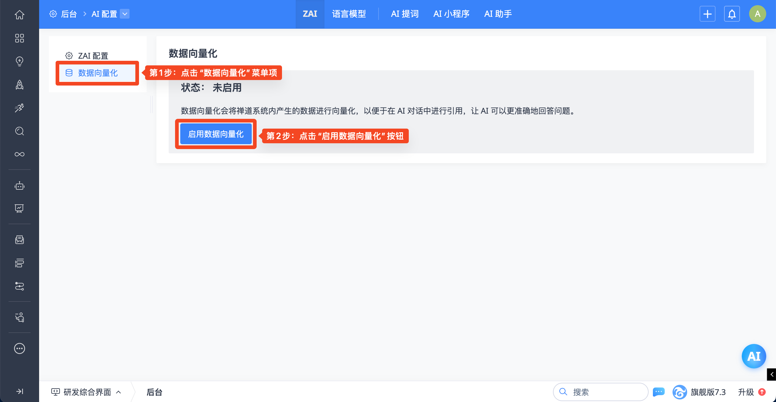 要启用禅道数据向量化,点击 ZAI 界面左侧菜单中的“数据向量化”,首次需要手动启用,点击“启用数据向量化”按钮即可。禅道数据向量化需要预先在 ZAI 配置中配置管理密钥,请参考上文“配置 ZAI 服務”。