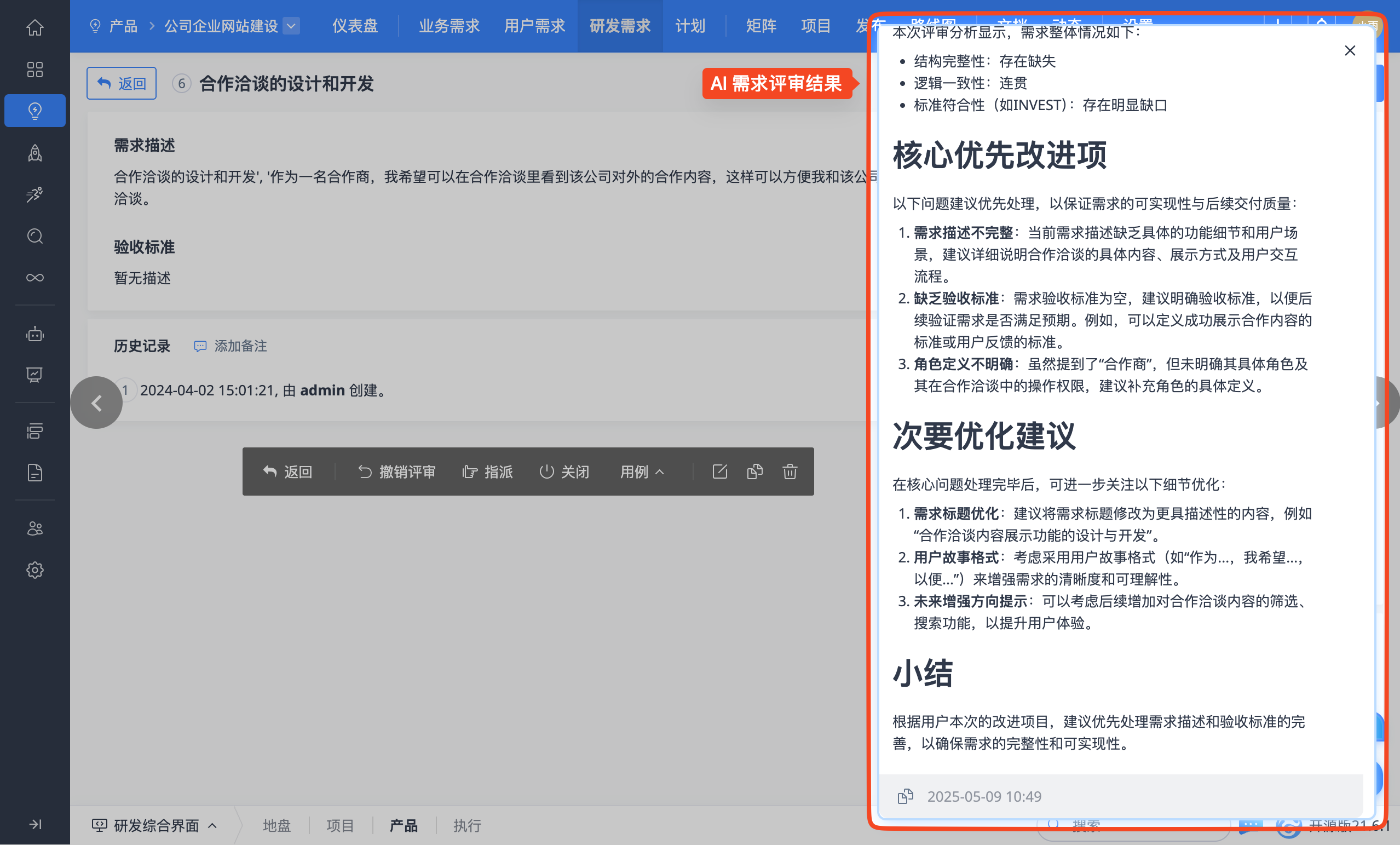 目前,AI 需求评审会给出结果總結、核心优先改进项和次要优化建议。修改需求后,可再次调用以获取新的评审建议。我们将在后续版本中进一步增强该功能,提供更强的交互式评审能力。
