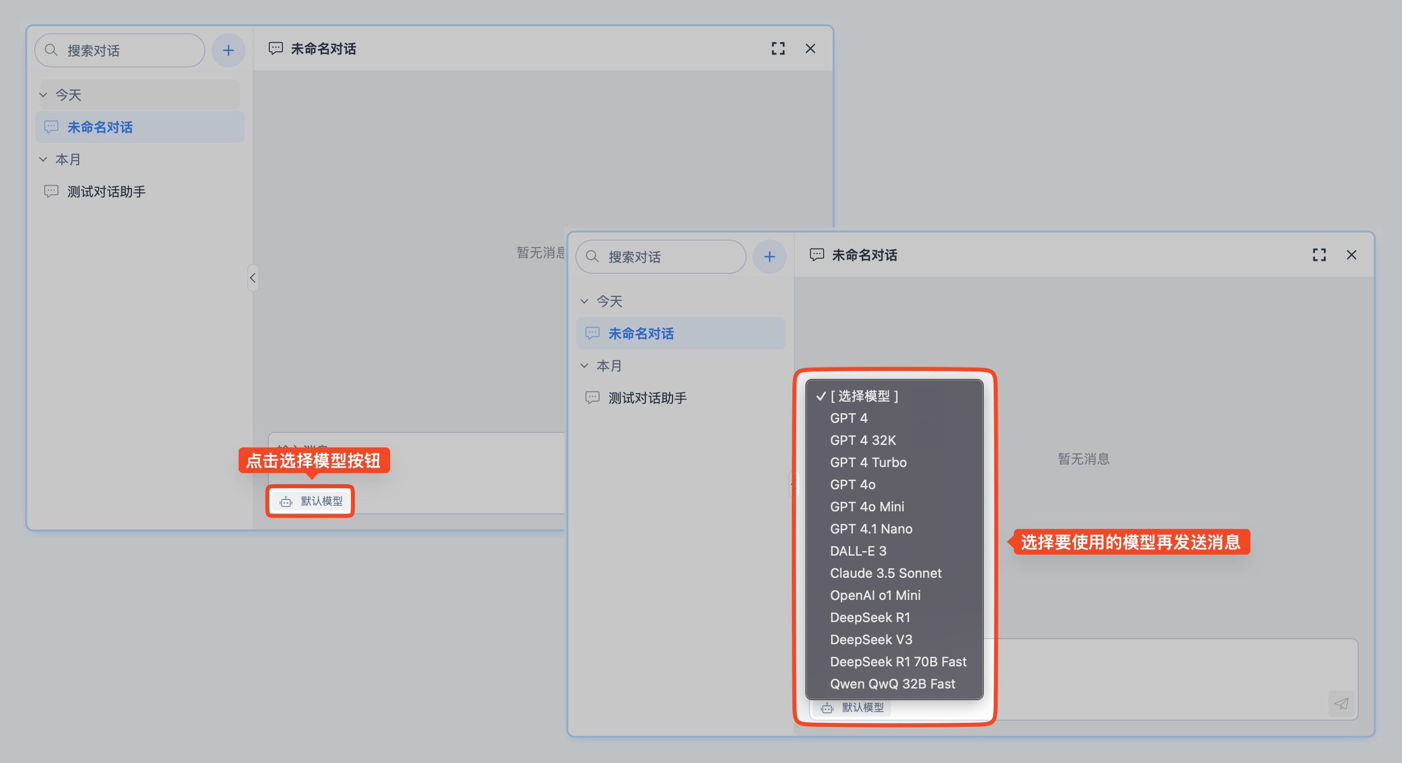 創建對話後,可點擊消息輸入框下方的模型選擇按鈕,選擇要使用的大模型,然後發送消息。