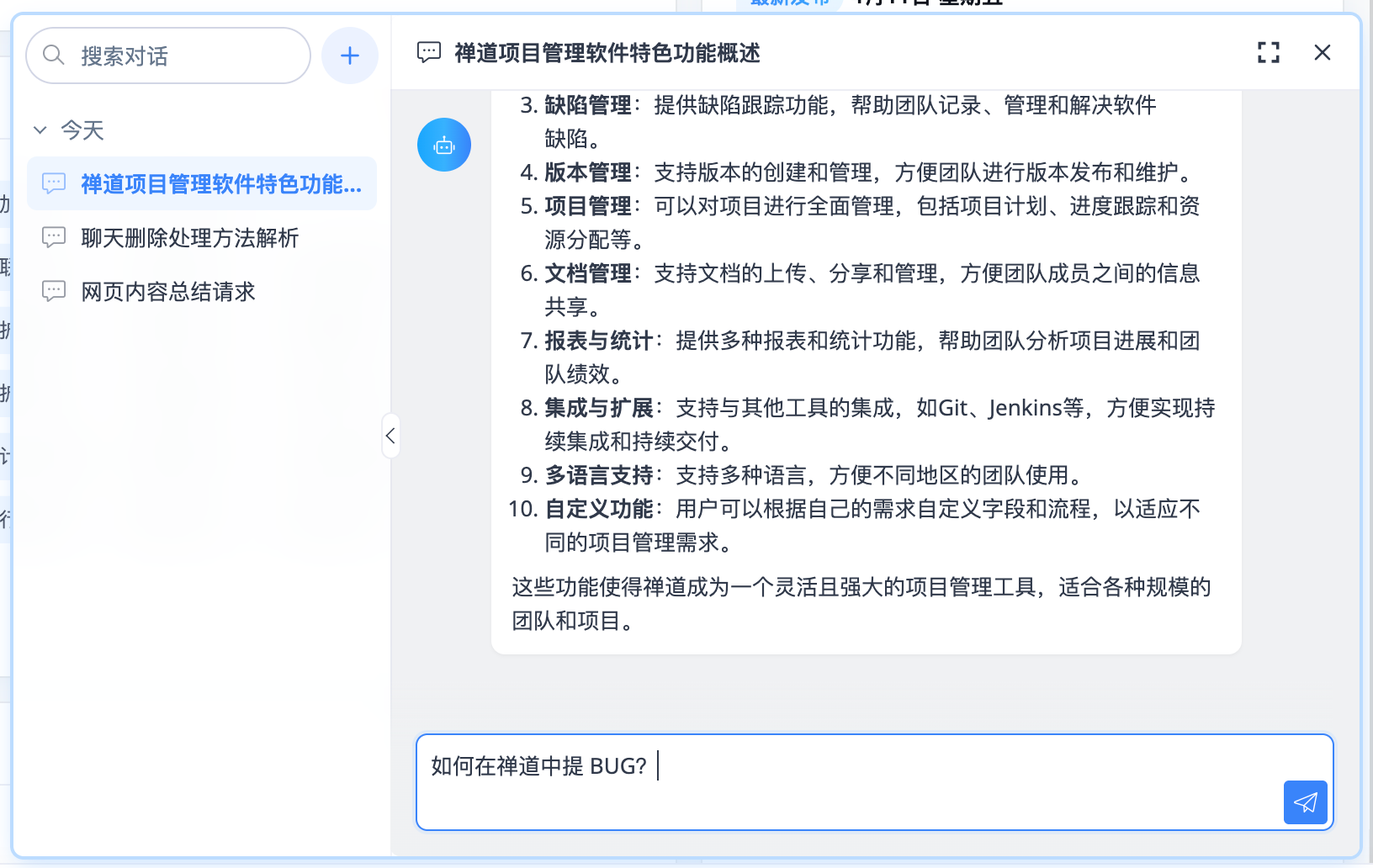 - 基于禅道數據向量化的上下文,以最後一次同步時的數據爲准,不會實時根據禅道當前數據更新;
