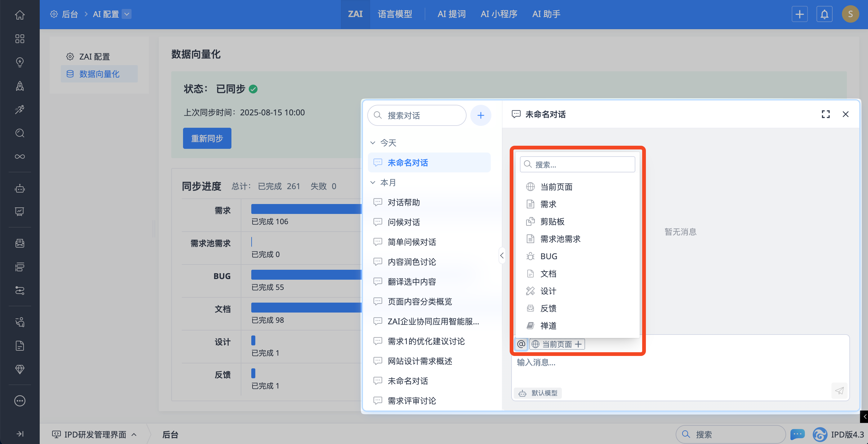 在进行 AI 对话时,支持将外部数据快捷地添加到对话中。这些数据可能来自当前界面,也可能来自向量化数据,例如当前页面内容、禅道文檔等。