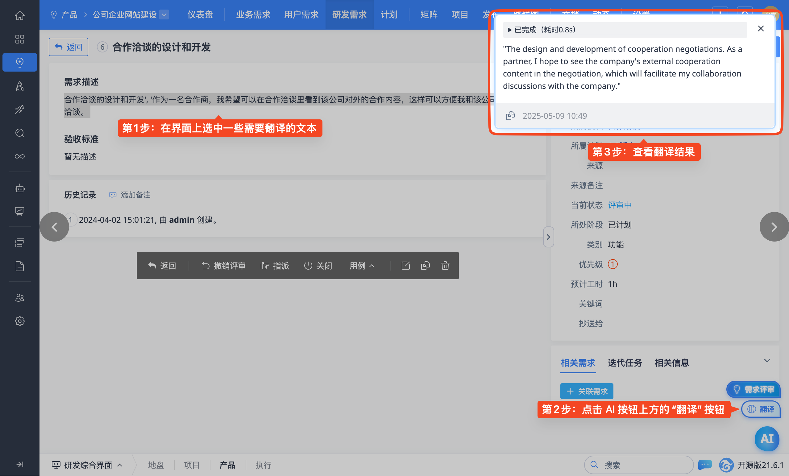 禅道 AI 插件提供“翻譯”功能。在页面选中需要翻譯的内容后,全局 AI 按钮上方会显示“翻譯”快捷按钮;点击后,会在页面右上方弹出面板展示翻譯结果。