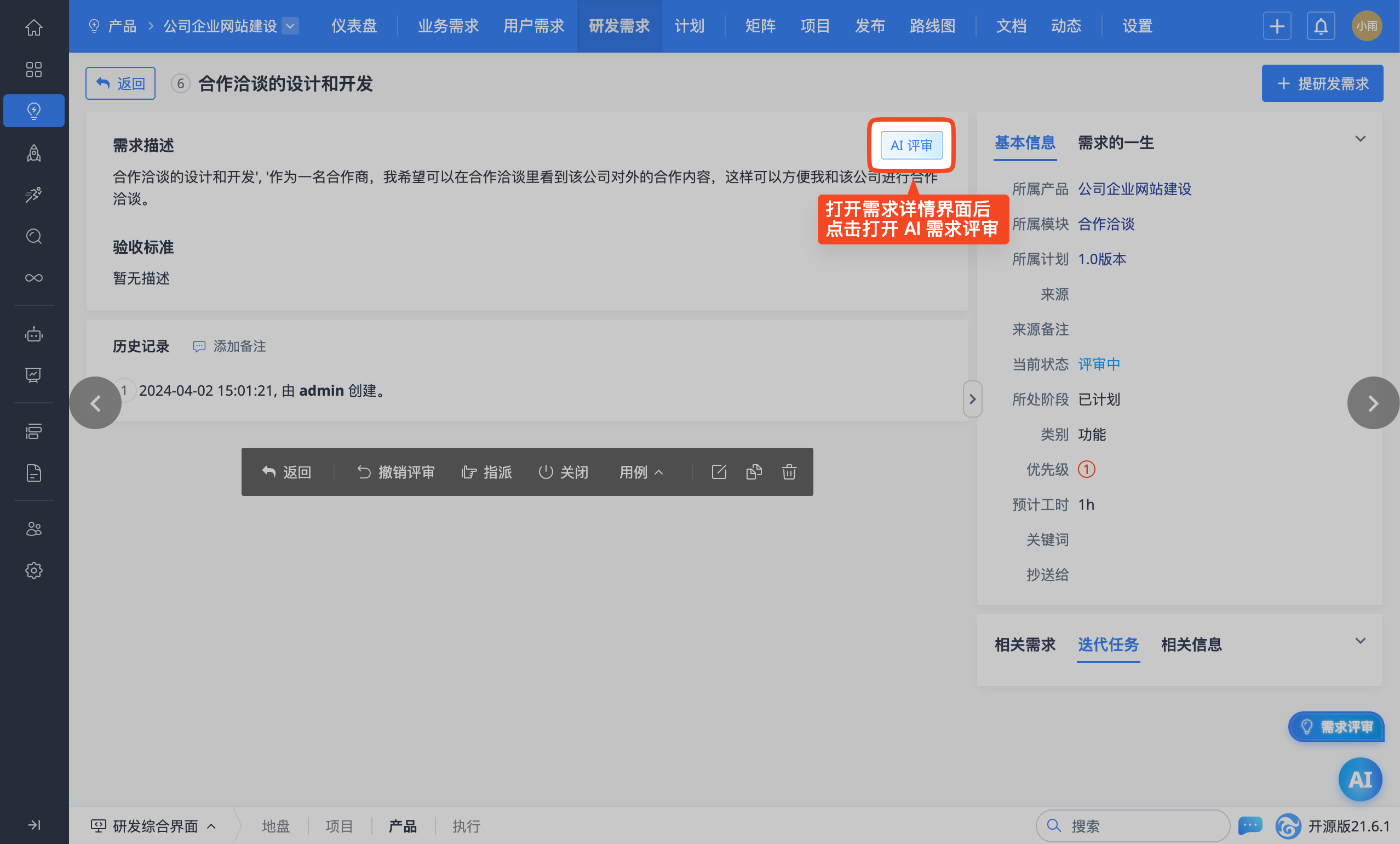 进入需求详情页面后,全局 AI 按钮上方也会智能提示“需求评审”快捷按钮,点击同样可使用。