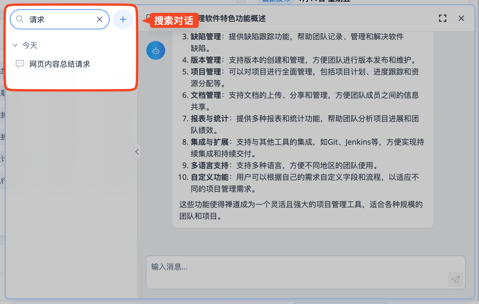 在對話列表上方的搜索框输入关键字,可按对话标题进行搜索。