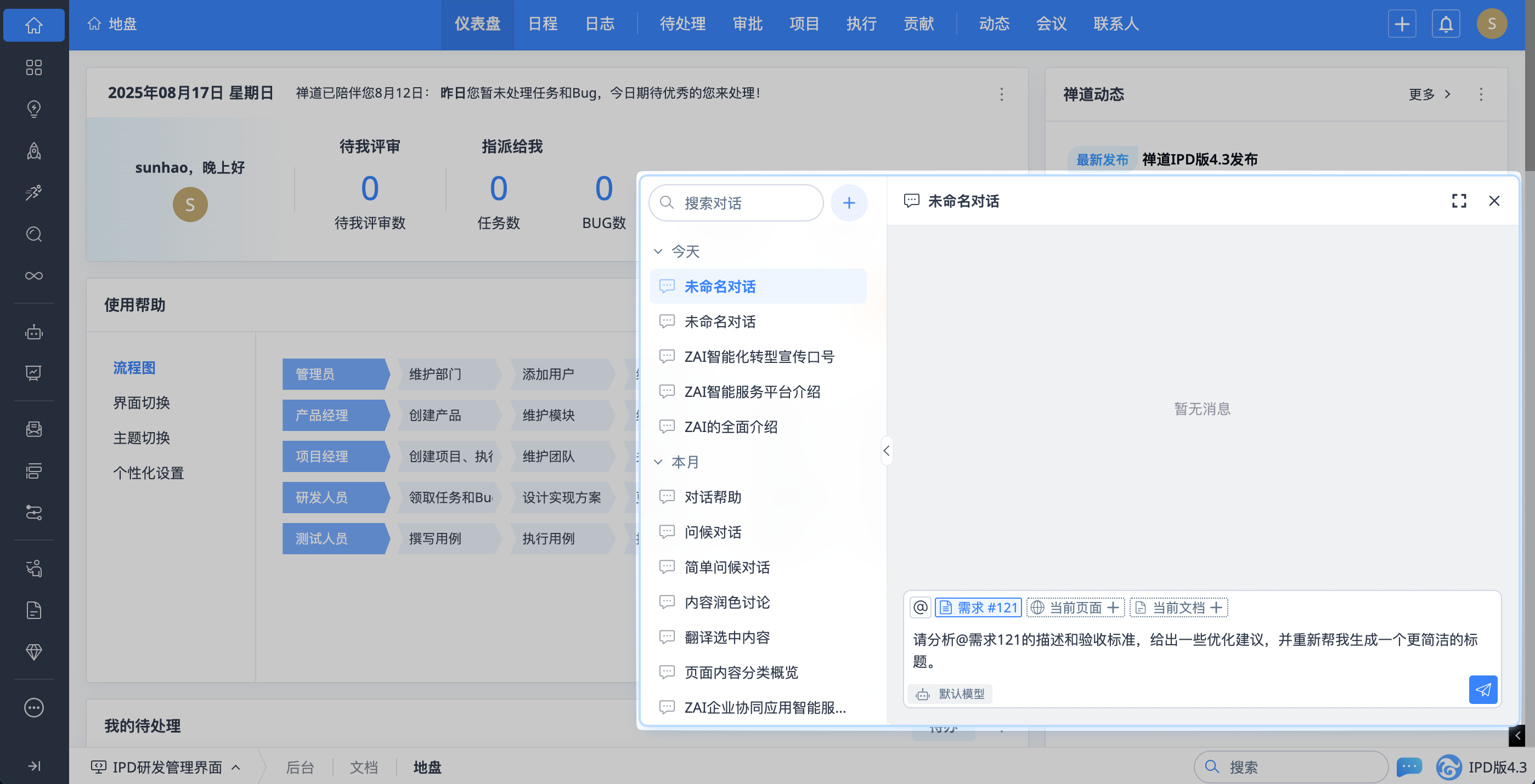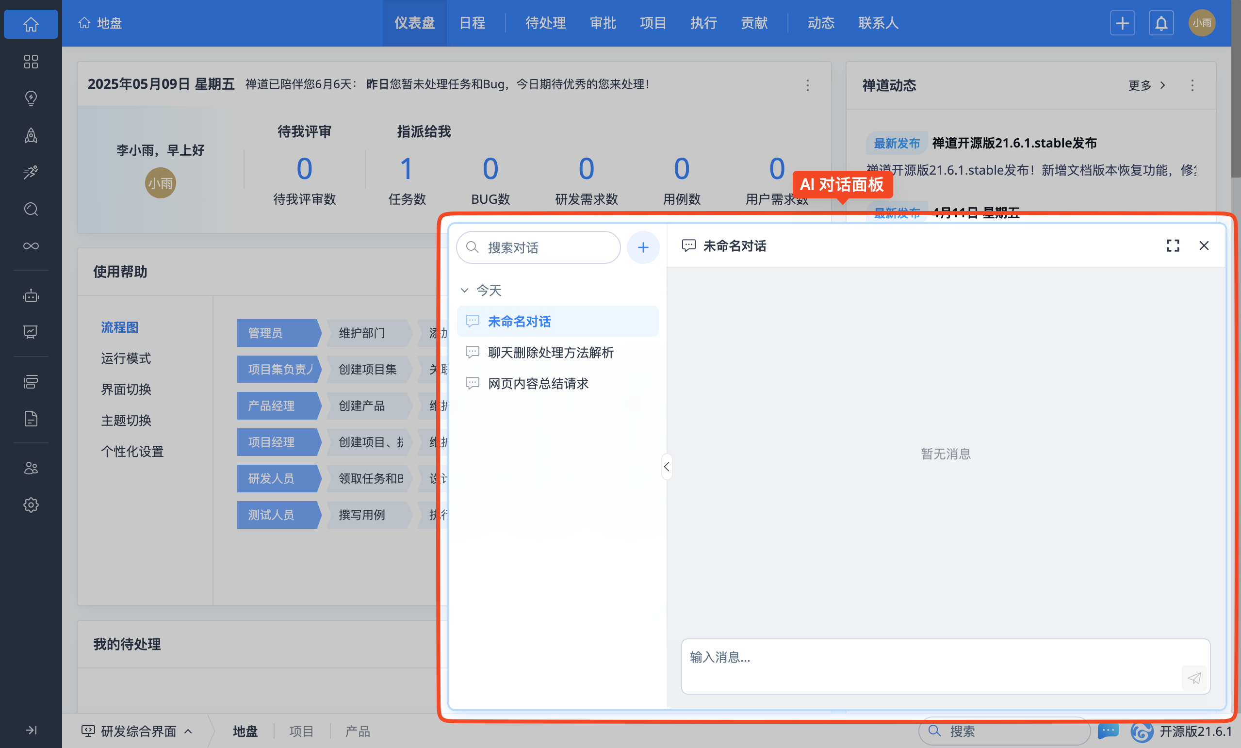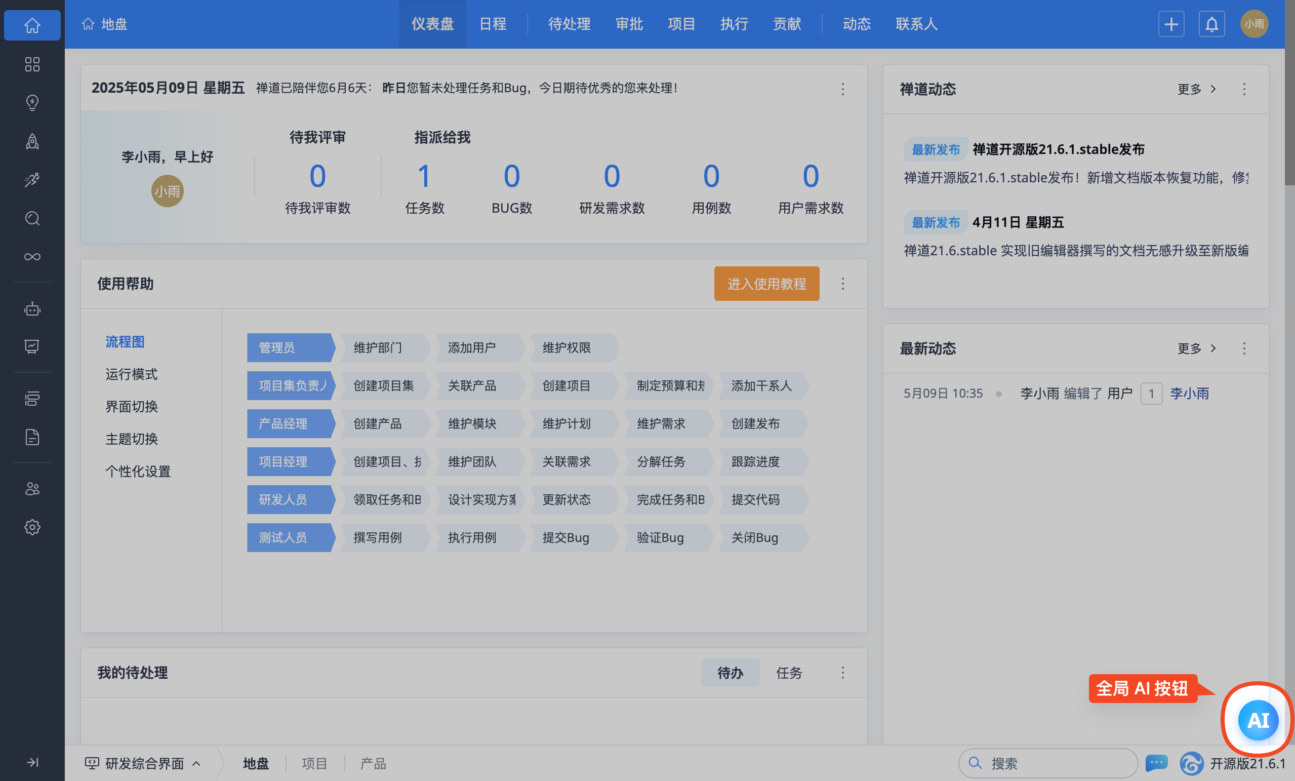 安装好插件并配置好 ZAI 服務后,登录禅道即可使用 AI 插件提供的功能。下面分别介绍: