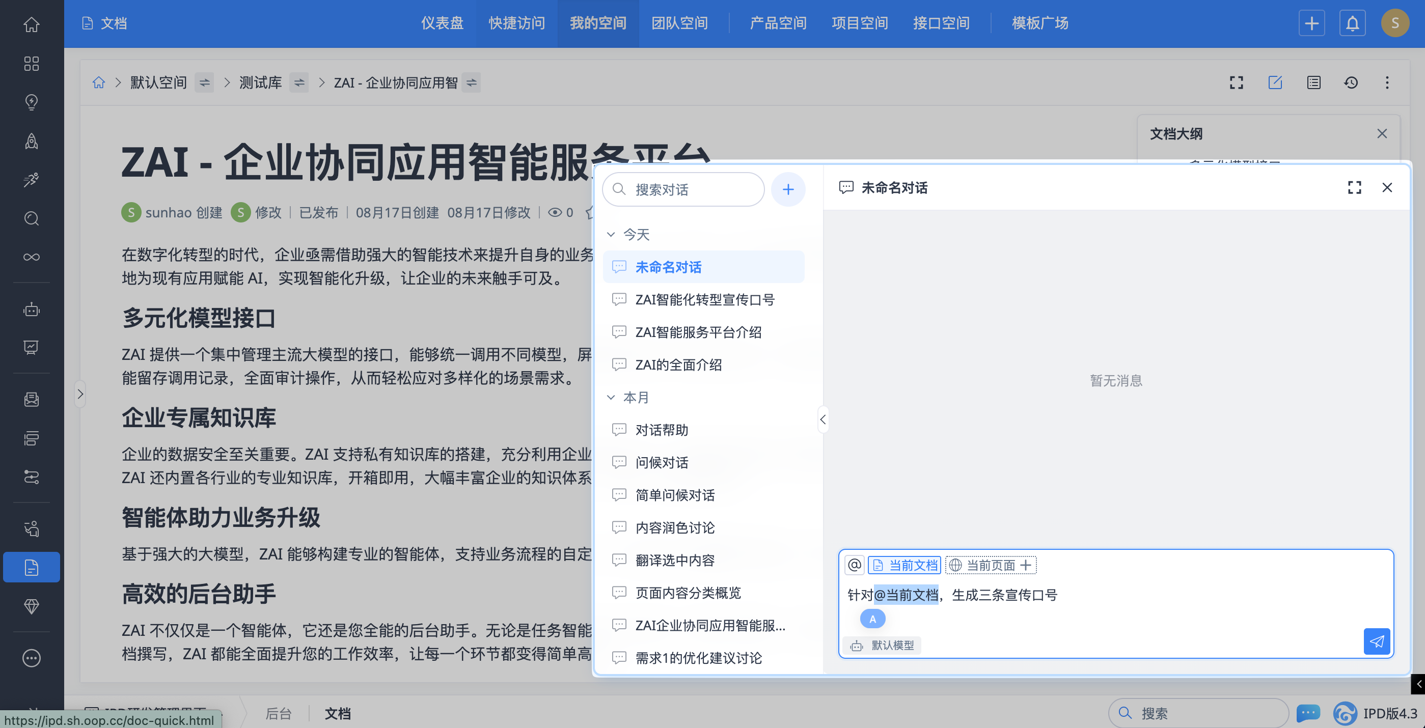 点击全局 AI 按钮,会打开通用 AI 对话面板。在该面板可查看所有历史对话并創建新對話;选中对话后,可在右侧查看消息,并与大模型进行对话。