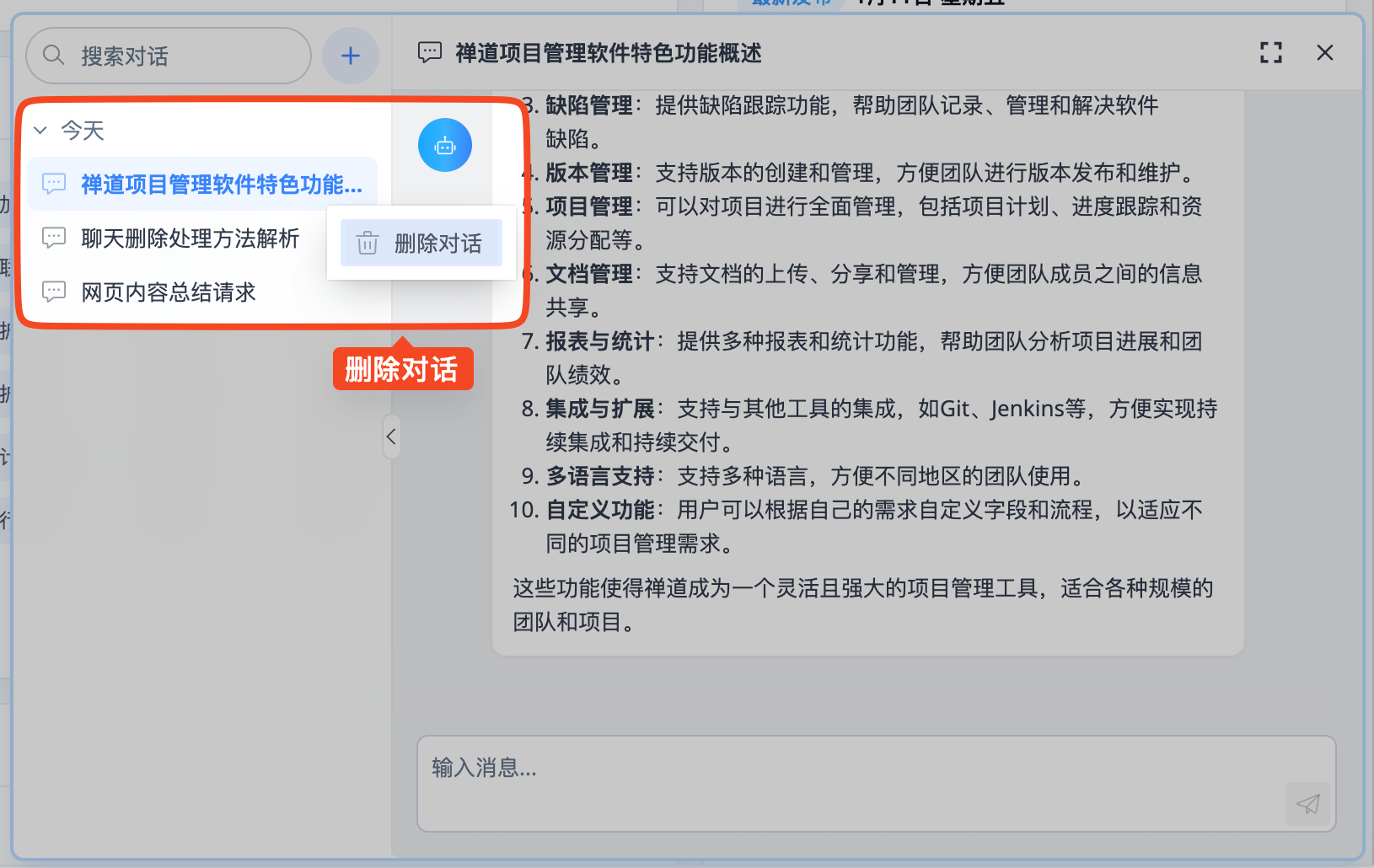 点击對話列表项右侧的“更多”按钮,在菜单中选择“删除”,即可将该对话从历史列表中移除。