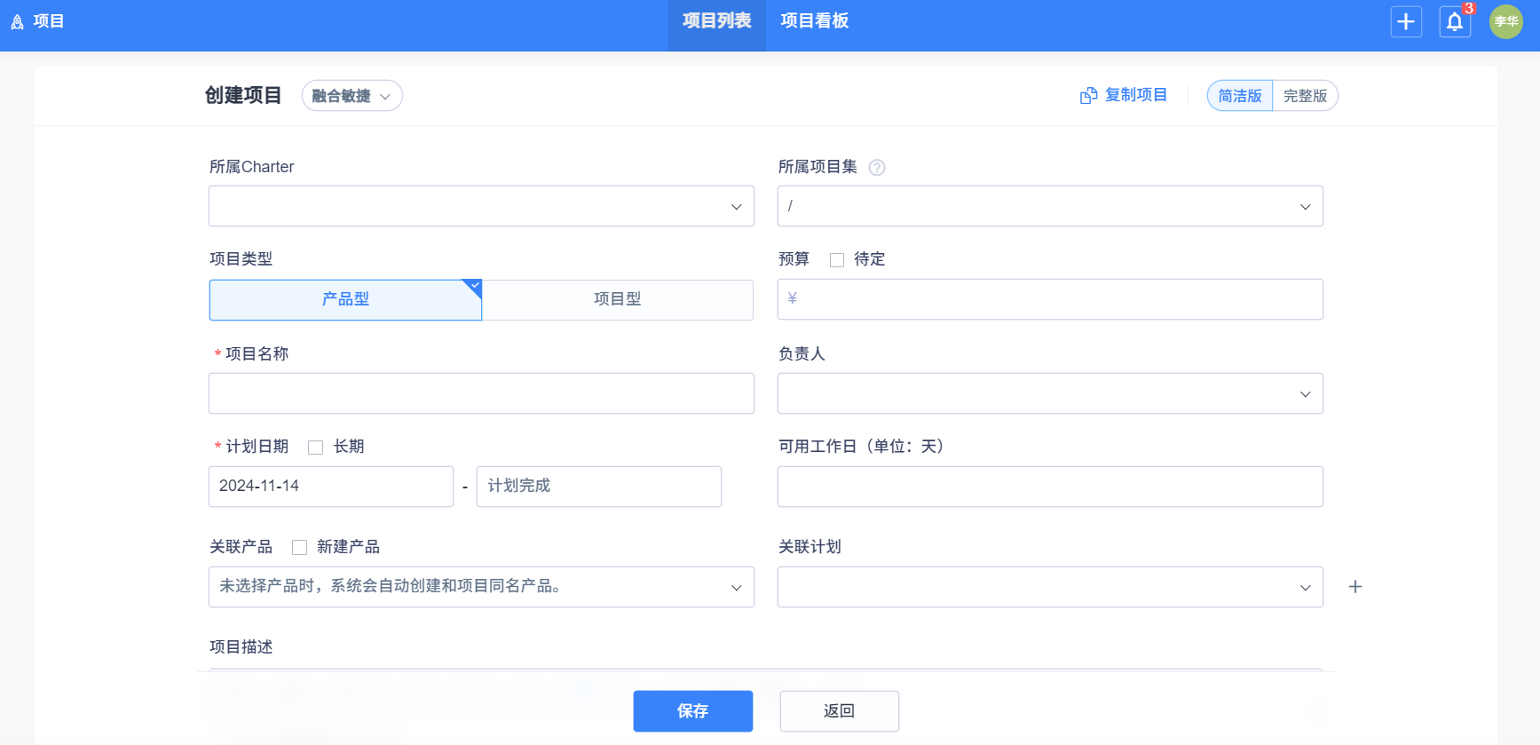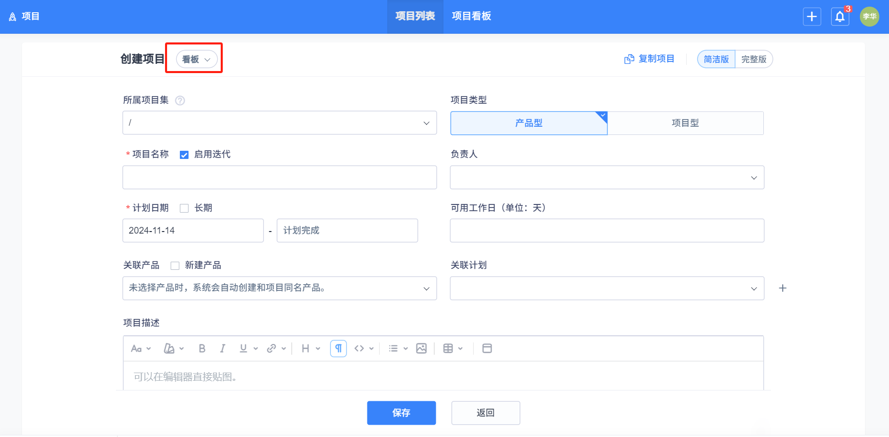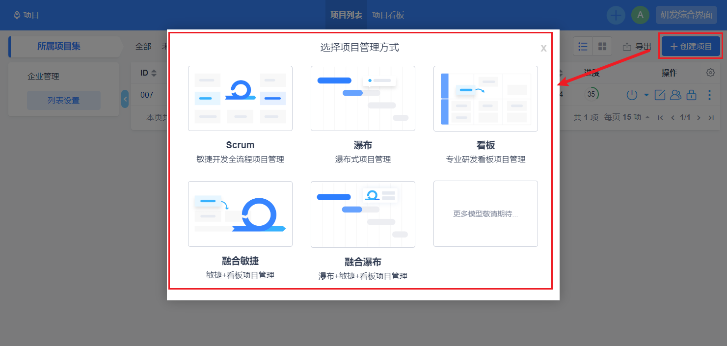 項目管理方式点击选择 看板(专业研发看板項目管理),填写好信息,点击保存即可。