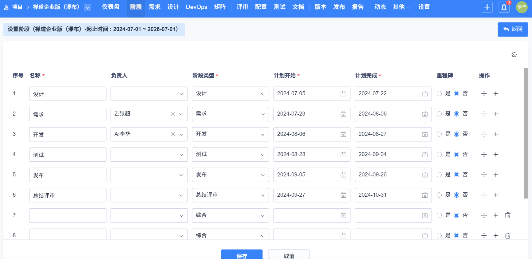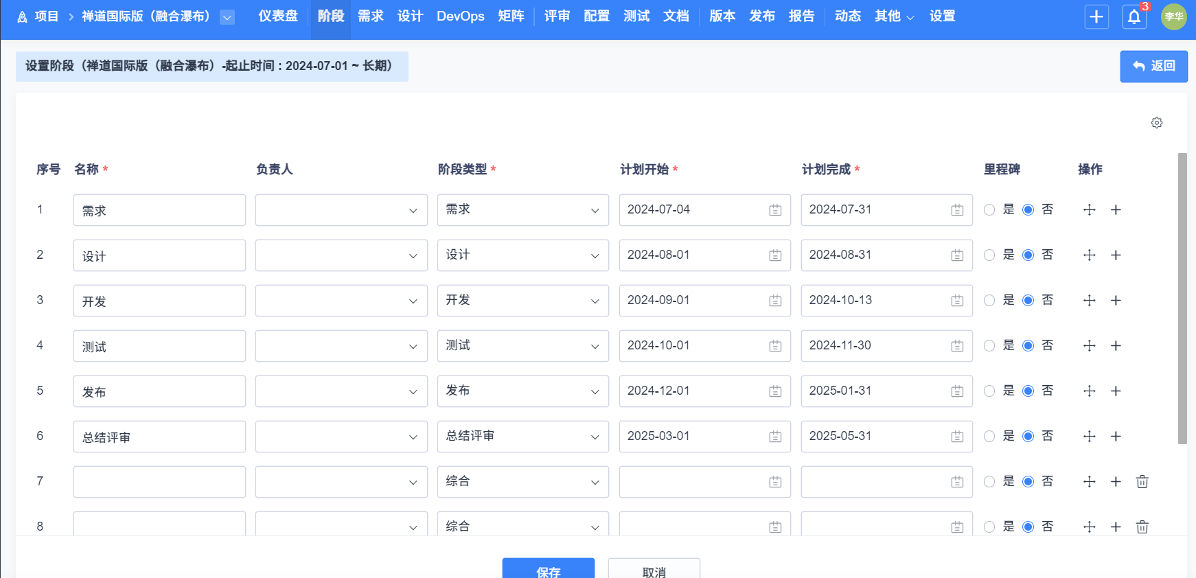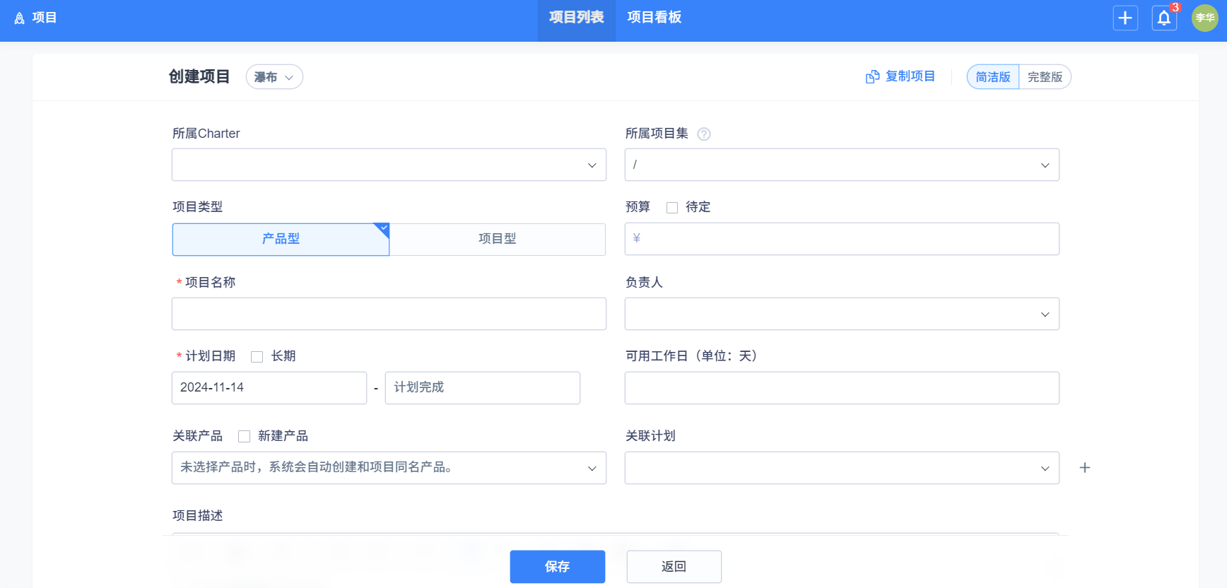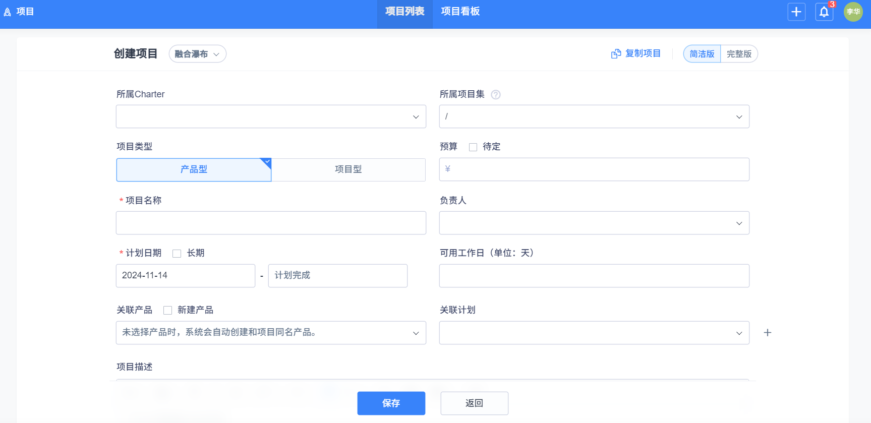 項目管理方式点击选择 瀑布(瀑布式項目管理),填写好信息,点击保存即可。