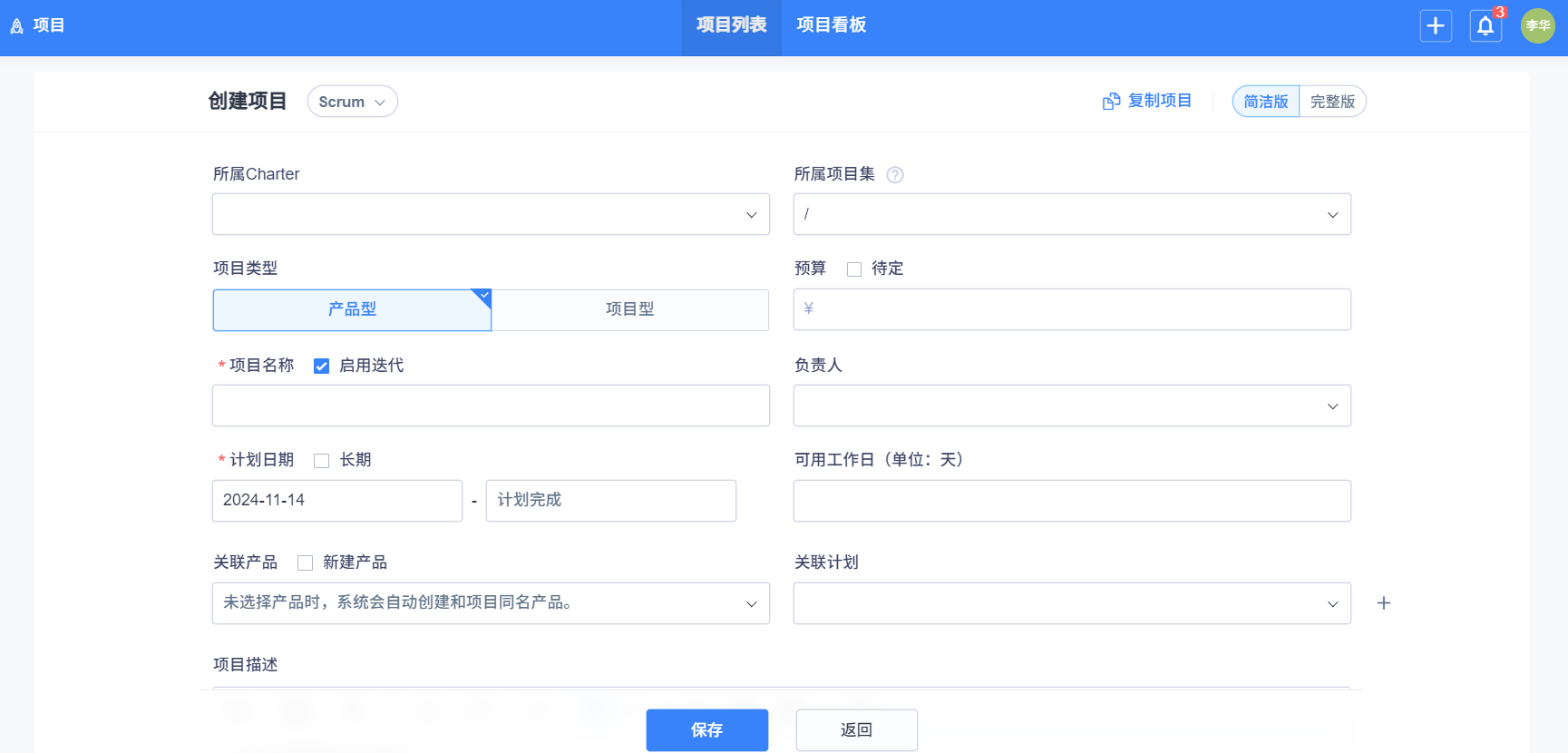 項目管理方式点击选择 Scrum(敏捷開發全流程項目管理),填写好信息,点击保存即可。
