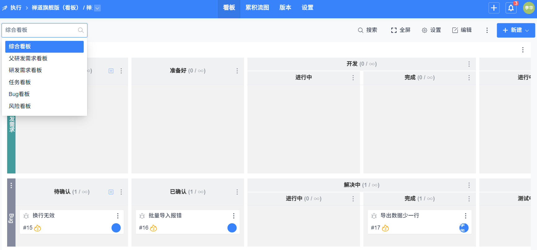 看板項目下的看板,包含综合看板、需求看板、任务看板、Bug看板。