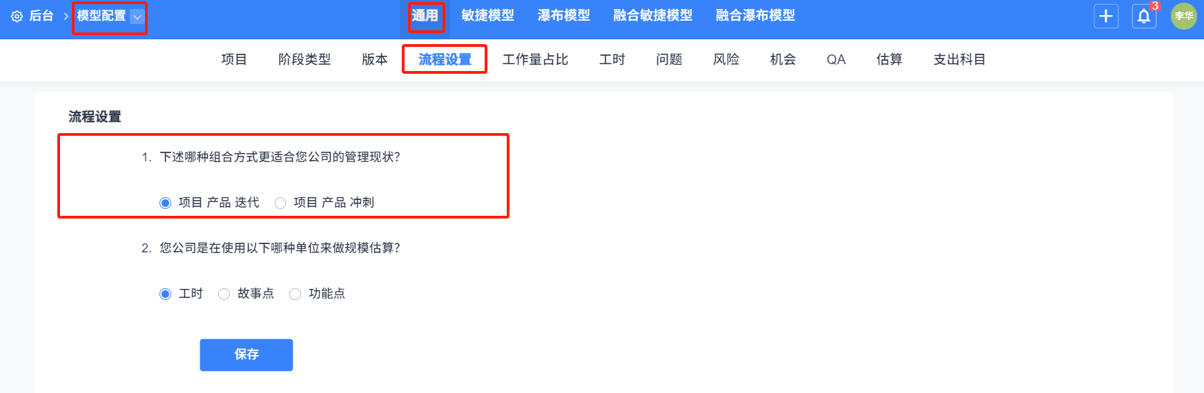 項目管理方式点击选择融合瀑布,填写好信息,点击保存即可。