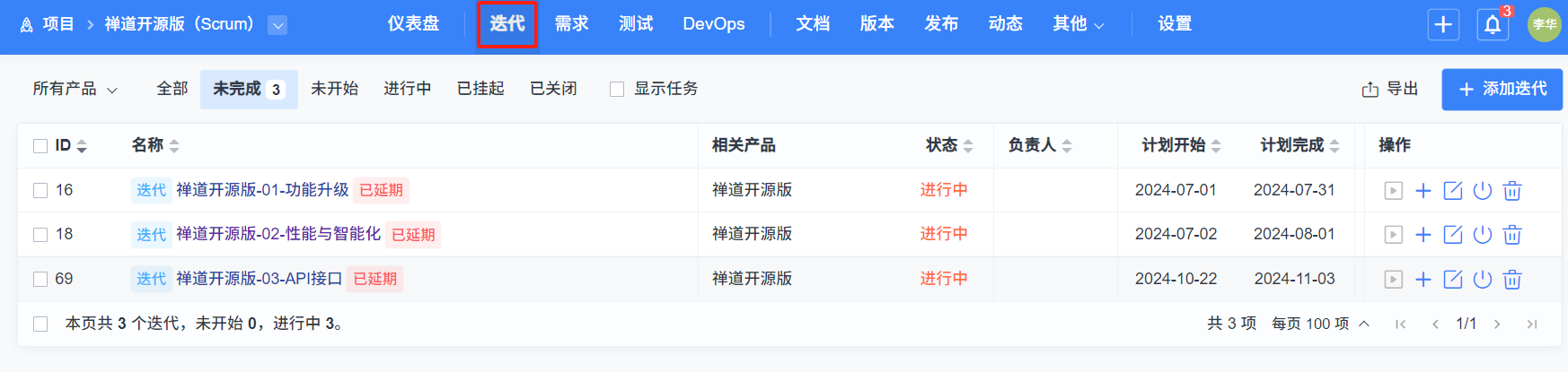 在禅道15版本中,根据选择管理模型的不同,一个项目可以包含多个冲刺或阶段,我们把多个迭代/冲刺或阶段统称为執行。一个執行对应一个冲刺,通过執行去完成项目的任务,交付最终的结果。