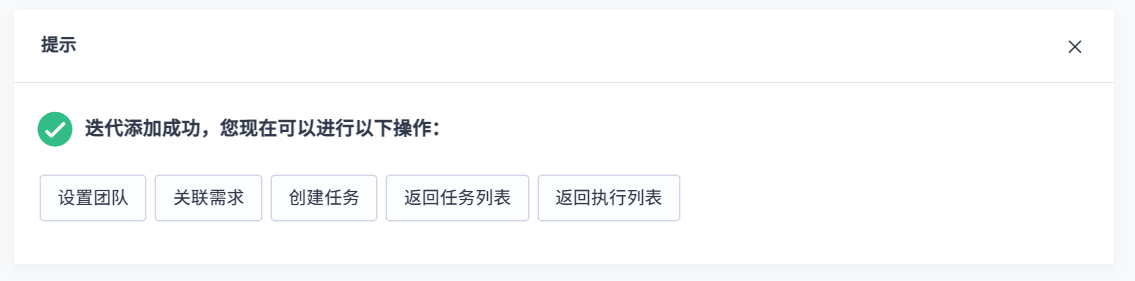 冲刺添加成功后,会收到弹窗提示。建议按照“設置团队”->"关联研发需->"创建任务"的顺序进行操作。