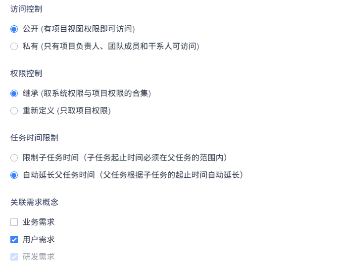 在项目模块下,点击“創建項目”。你可以为项目集创建一个所属项目或者创建一个独立项目。注意設置“访问控制”、“权限控制”、“任务时间限制”(企业版功能)、“關聯需求概念設置”。