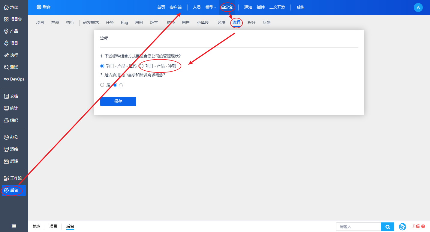 - 如果你在“后台”-“自定义”-“流程”中,将管理流程設置为“项目-産品-冲刺”,那么你再上述页面看到的将是“冲刺”,而不是“迭代”。