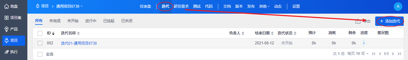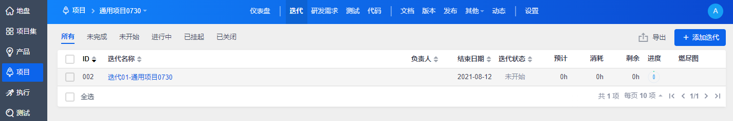 创建了项目后,我们就可以添加執行,設置团队、關聯需求、分解任务,进行正常的研发工作了。