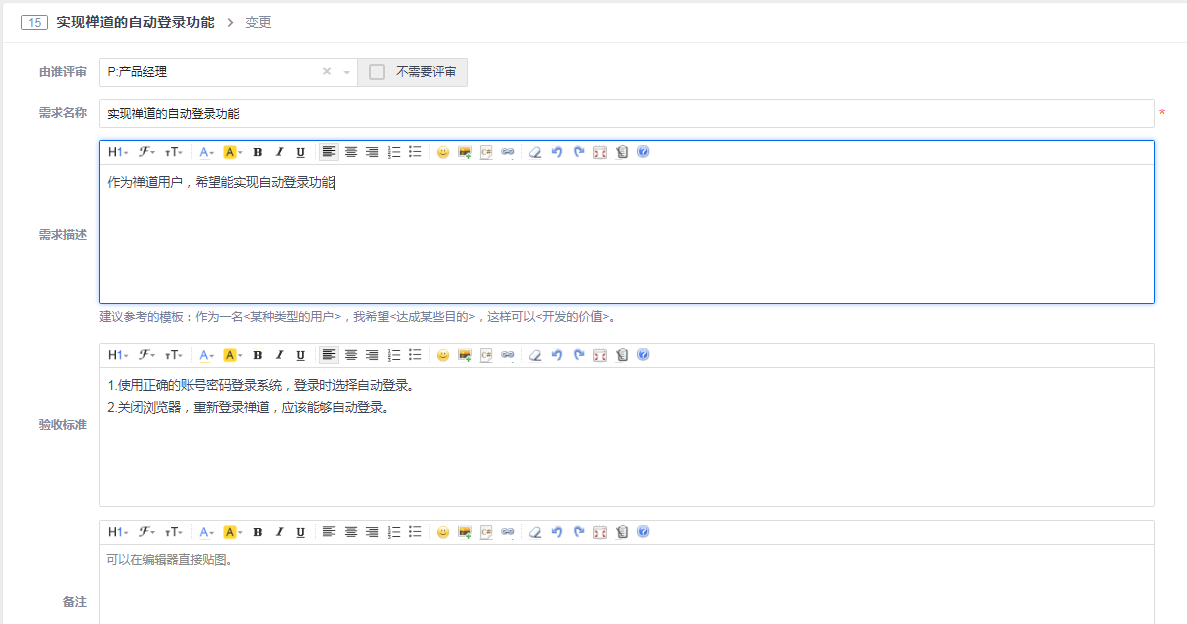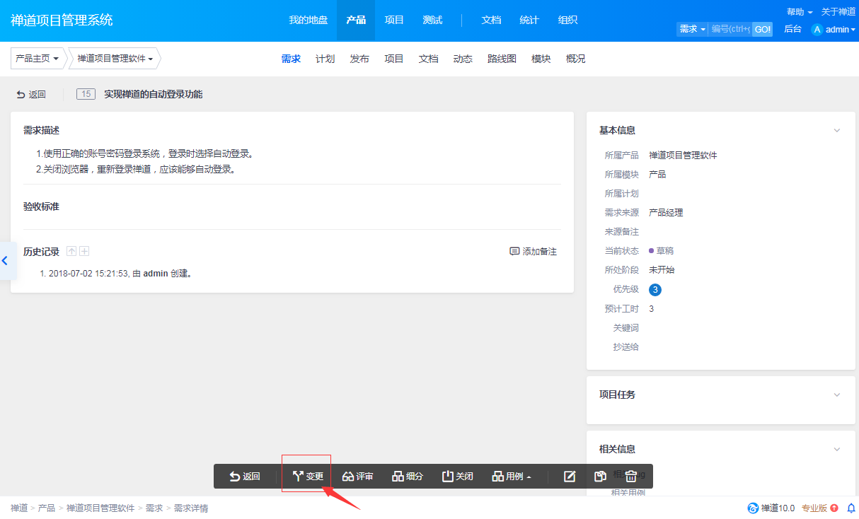 禅道專門提供了需求的變更流程。凡是對需求標題、描述、驗證標准和附件的修改,都應該走變更流程。變更之後的需求狀態爲變更中。