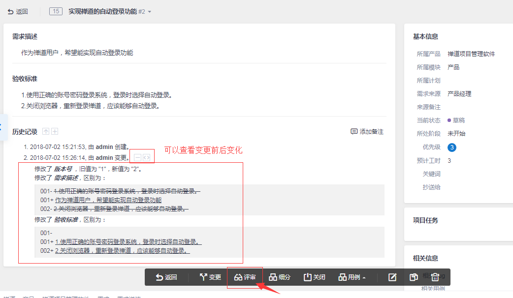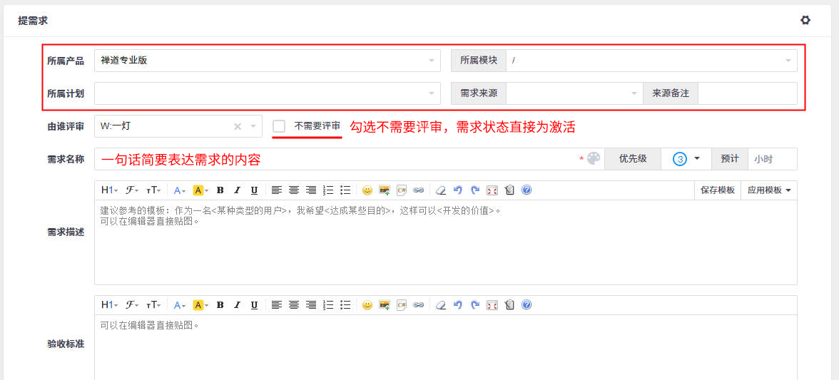 - 創建需求的時候可以選擇由誰來進行評審,這樣創建的需求狀態是草稿狀態。如果勾選了”不需要評審“,則是激活狀態。