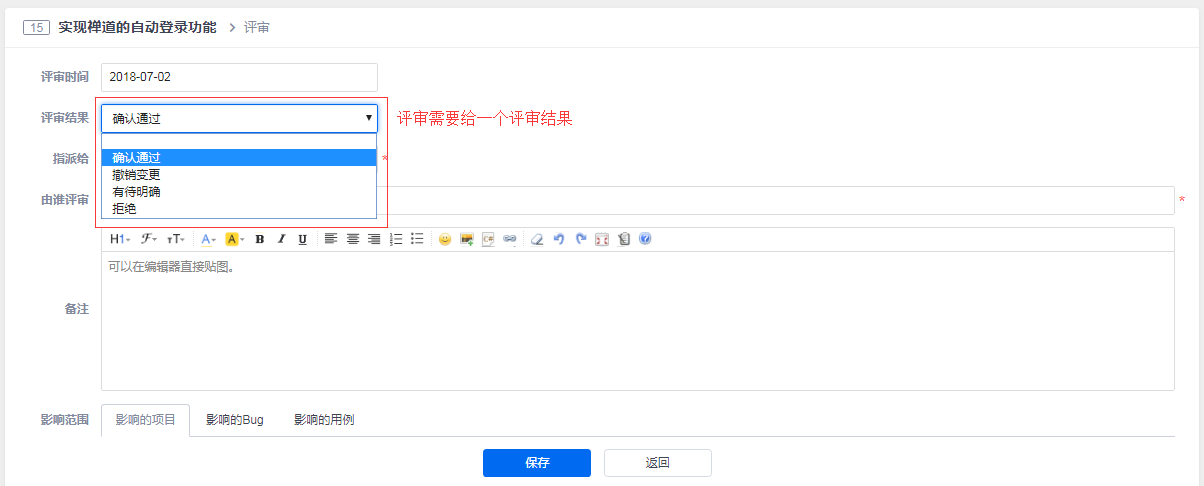 評審結果可以選擇確認通過,撤銷變更,有待明確或者拒絕。