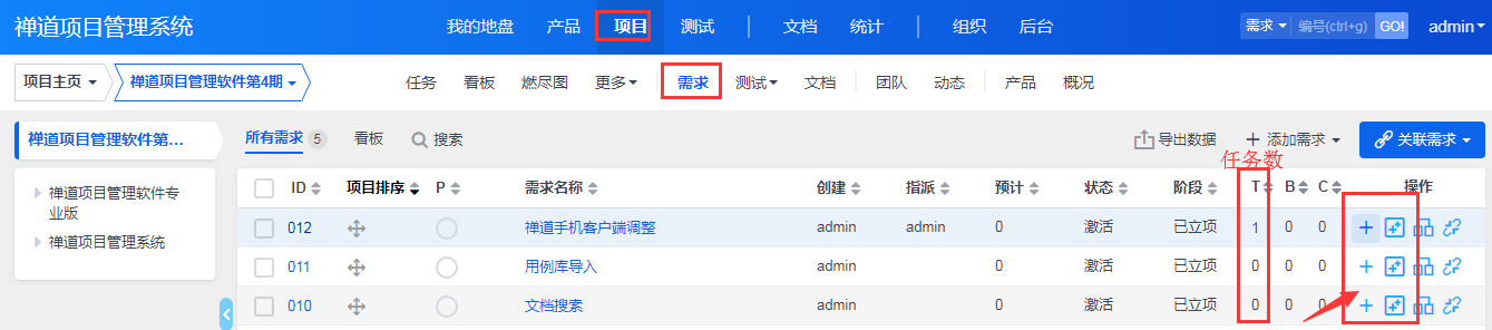 在項目的需求列表頁面,可以很方便地對某一個需求進行任務分解。同時還可以查看這個需求已經分解的任務數。列表字段中的T/B/C分別代表任務數/bug數/用例數。
