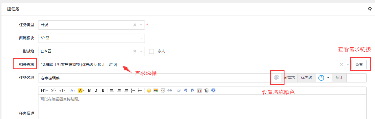 - 如果需求和任務的標題是一樣的,可以通過”同需求“按鈕快捷的複制需求的標題。