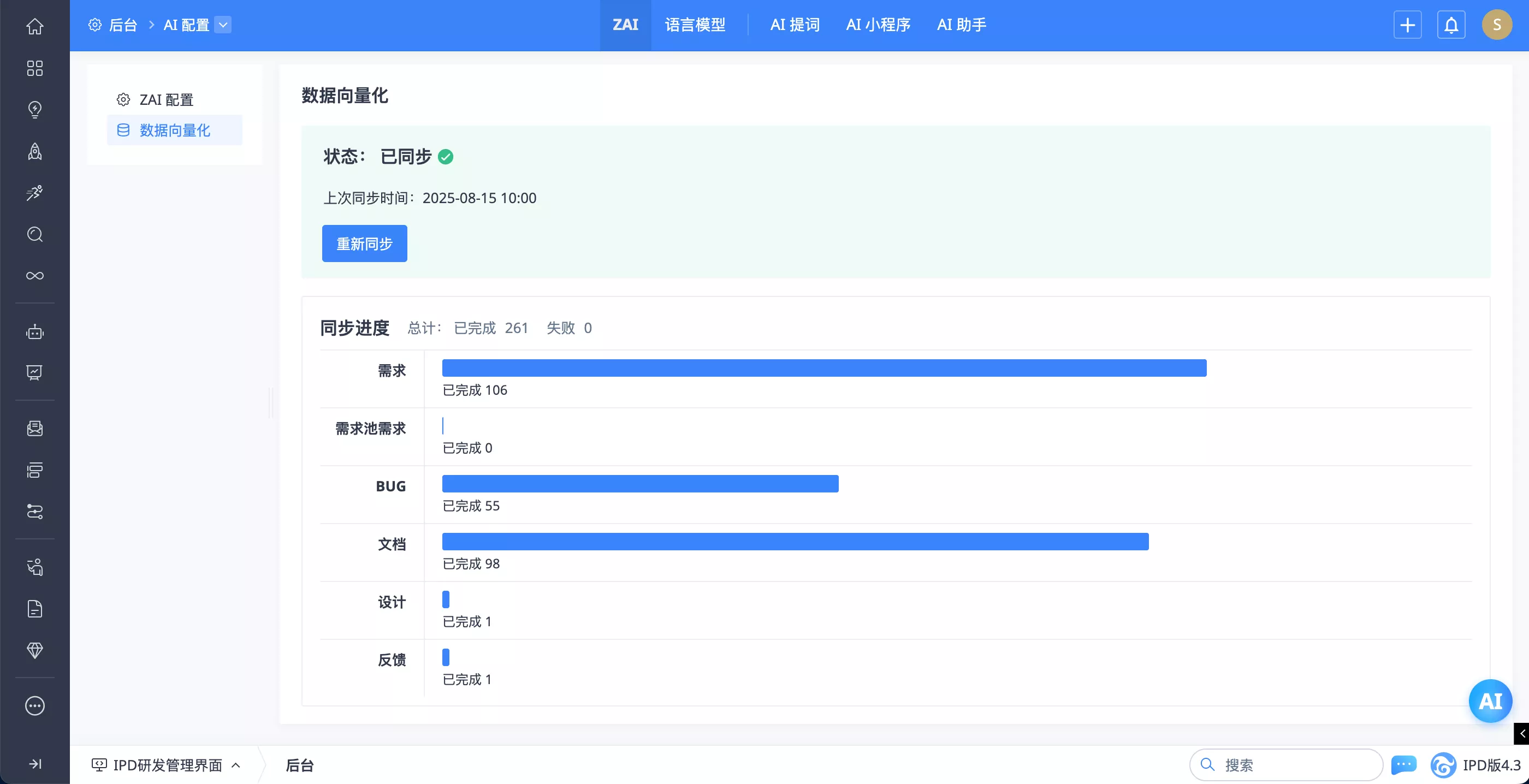 禅道數據向量化暂不支持实时更新,需要手动进行同步更新,我们将在后续版本中进一步增强该功能,带来更好的体验。
