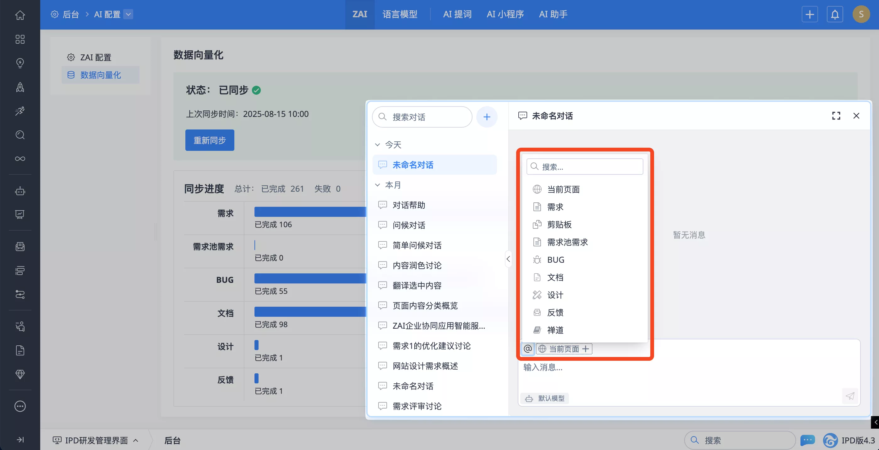 新增禅道數據向量化,支持將禅道中的需求、BUG、文檔等數據進行向量化處理,讓AI能夠快速檢索相關信息,提供基于禅道數據進行的智能分析。在AI對話中還可以引入當前頁面、文檔等作爲上下文,讓AI更准確的理解當前任務。